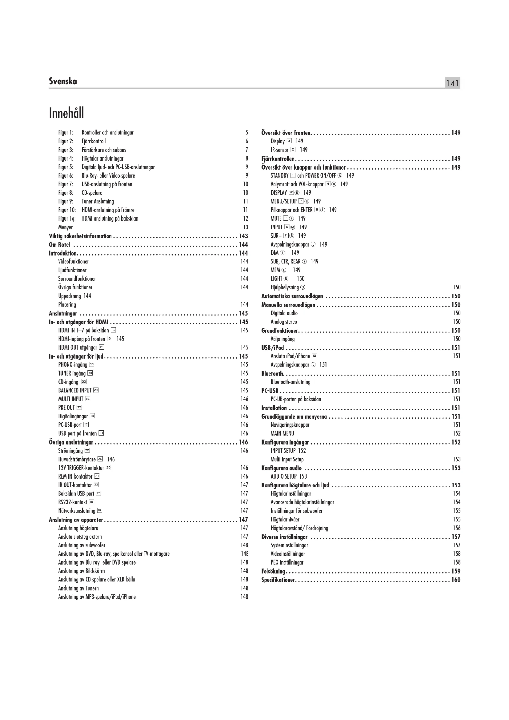 - Videofunktioner 144 Ljudfunktioner 144 Surroundfunktioner 144 Övriga funktioner 144 Uppackning 144 Placering 144 Anslutningar p. 145