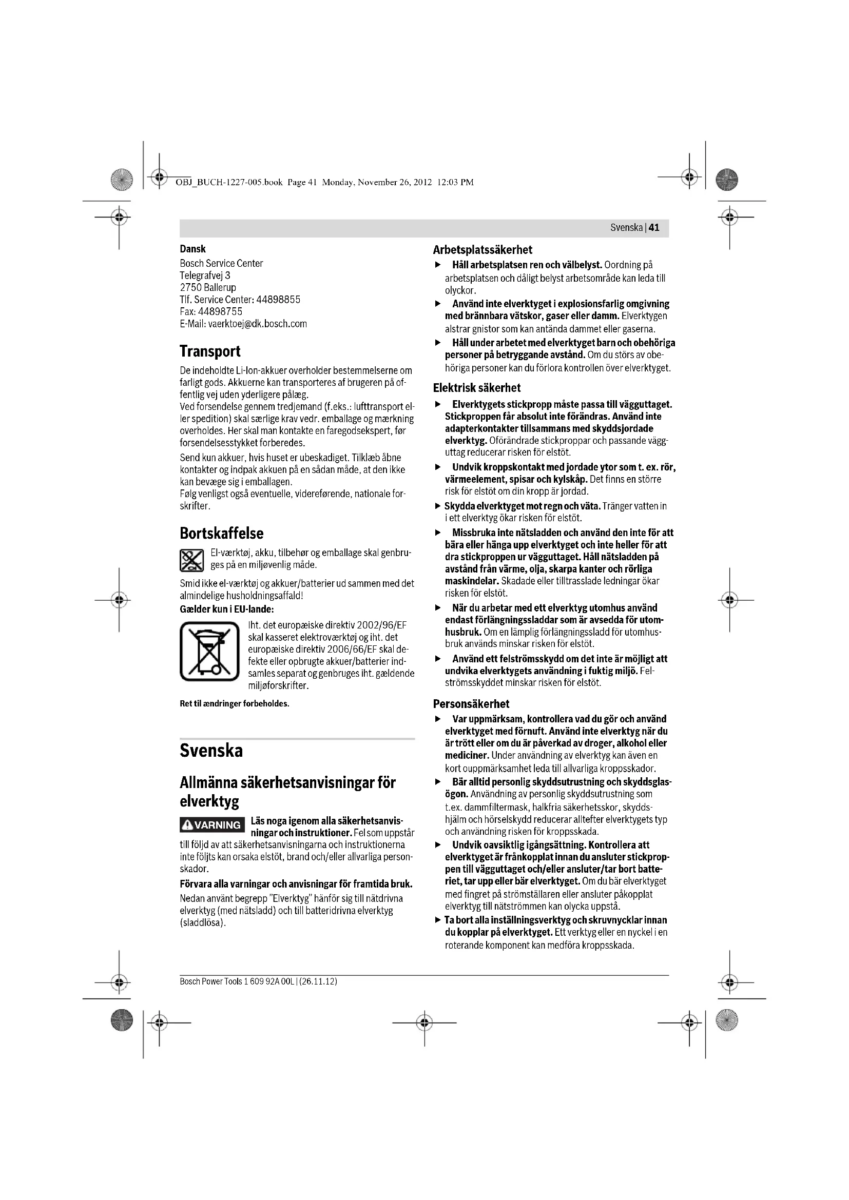Valg af tilbehør – 147 OBJ_BUCH-1227-005.book Page 40 Monday, November 26, 2012 12:03 PMSvenska | 41 Bosch Power Tools 1 609 92A 00L | (26.11.12) Dansk Bosch Service Center Telegrafvej 3 2750 Ballerup Tlf. Service Center: 44898855 Fax: 44898755 E-Mail: vaerktoej@dk.bosch.com Transport De indeholdte Li-Ion-akkuer overholder bestemmelserne om farligt gods. Akkuerne kan transporteres af brugeren på of- fentlig vej uden yderligere pålæg. Ved forsendelse gennem tredjemand (f.eks.: lufttransport el- ler spedition) skal særlige krav vedr. emballage og mærkning overholdes. Her skal man kontakte en faregodsekspert, før forsendelsesstykket forberedes. Send kun akkuer, hvis huset er ubeskadiget. Tilklæb åbne kontakter og indpak akkuen på en sådan måde, at den ikke kan bevæge sig i emballagen. Følg venligst også eventuelle, videreførende, nationale for- skrifter. Bortskaffelse El-værktøj, akku, tilbehør og emballage skal genbru- ges på en miljøvenlig måde. Smid ikke el-værktøj og akkuer/batterier ud sammen med det almindelige husholdningsaffald! Gælder kun i EU-lande: Iht. det europæiske direktiv 2002/96/EF skal kasseret elektroværktøj og iht. det europæiske direktiv 2006/66/EF skal de- fekte eller opbrugte akkuer/batterier ind- samles separat og genbruges iht. gældende miljøforskrifter. Ret til ændringer forbeholdes. Svenska Allmänna säkerhetsanvisningar för elverktyg Läs noga igenom alla säkerhetsanvis- ningar och instruktioner. Fel som uppstår till följd av att säkerhetsanvisningarna och instruktionerna inte följts kan orsaka elstöt, brand och/eller allvarliga person- skador. Förvara alla varningar och anvisningar för framtida bruk. Nedan använt begrepp ”Elverktyg” hänför sig till nätdrivna elverktyg (med nätsladd) och till batteridrivna elverktyg (sladdlösa). Arbetsplatssäkerhet Håll arbetsplatsen ren och välbelyst. Oordning på arbetsplatsen och dåligt belyst arbetsområde kan leda till olyckor. Använd inte elverktyget i explosionsfarlig omgivning med brännbara vätskor, gaser eller damm. Elverktygen alstrar gnistor som kan antända dammet eller gaserna. Håll under arbetet med elverktyget barn och obehöriga personer på betryggande avstånd. Om du störs av obe- höriga personer kan du förlora kontrollen över elverktyget. Elektrisk säkerhet Elverktygets stickpropp måste passa till vägguttaget. Stickproppen får absolut inte förändras. Använd inte adapterkontakter tillsammans med skyddsjordade elverktyg. Oförändrade stickproppar och passande vägg- uttag reducerar risken för elstöt. Undvik kroppskontakt med jordade ytor som t. ex. rör, värmeelement, spisar och kylskåp. Det finns en större risk för elstöt om din kropp är jordad. Skydda elverktyget mot regn och väta. Tränger vatten in i ett elverktyg ökar risken för elstöt. Missbruka inte nätsladden och använd den inte för att bära eller hänga upp elverktyget och inte heller för att dra stickproppen ur vägguttaget. Håll nätsladden på avstånd från värme, olja, skarpa kanter och rörliga maskindelar. Skadade eller tilltrasslade ledningar ökar risken för elstöt. När du arbetar med ett elverktyg utomhus använd endast förlängningssladdar som är avsedda för utom- husbruk. Om en lämplig förlängningssladd för utomhus- bruk används minskar risken för elstöt. Använd ett felströmsskydd om det inte är möjligt att undvika elverktygets användning i fuktig miljö. Fel- strömsskyddet minskar risken för elstöt. Personsäkerhet Var uppmärksam, kontrollera vad du gör och använd elverktyget med förnuft. Använd inte elverktyg när du är trött eller om du är påverkad av droger, alkohol eller mediciner. Under användning av elverktyg kan även en kort ouppmärksamhet leda till allvarliga kroppsskador. Bär alltid personlig skyddsutrustning och skyddsglas- ögon. Användning av personlig skyddsutrustning som t.ex. dammfiltermask, halkfria säkerhetsskor, skydds- hjälm och hörselskydd reducerar alltefter elverktygets typ och användning risken för kroppsskada. Undvik oavsiktlig igångsättning. Kontrollera att elverktyget är frånkopplat innan du ansluter stickprop- pen till vägguttaget och/eller ansluter/tar bort batte- riet, tar upp eller bär elverktyget. Om du bär elverktyget med fingret på strömställaren eller ansluter påkopplat elverktyg till nätströmmen kan olycka uppstå. Ta bort alla inställningsverktyg och skruvnycklar innan du kopplar på elverktyget. Ett verktyg eller en nyckel i en roterande komponent kan medföra kroppsskada. VARNING OBJ_BUCH-1227-005.book Page 41 Monday, November 26, 2012 12:03 PM42 | Svenska 1 609 92A 00L | (26.11.12) Bosch Power Tools Undvik onormala kroppsställningar. Se till att du står stadigt och håller balansen. I detta fall kan du lättare kon- trollera elverktyget i oväntade situationer. Bär lämpliga arbetskläder. Bär inte löst hängande klä- der eller smycken. Håll håret, kläderna och handskarna på avstånd från rörliga delar. Löst hängande kläder, långt hår och smycken kan dras in av roterande delar. När elverktyg används med dammutsugnings- och -upp- samlingsutrustning, se till att dessa är rätt monterade och används på korrekt sätt. Användning av damm- utsugning minskar de risker damm orsakar. Korrekt användning och hantering av elverktyg Överbelasta inte elverktyget. Använd för aktuellt arbete avsett elverktyg. Med ett lämpligt elverktyg kan du arbeta bättre och säkrare inom angivet effektområde. Ett elverktyg med defekt strömställare får inte längre användas. Ett elverktyg som inte kan kopplas in eller ur är farligt och måste repareras. Dra stickproppen ur vägguttaget och/eller ta bort bat- teriet innan inställningar utförs, tillbehörsdelar byts ut eller elverktyget lagras. Denna skyddsåtgärd förhindrar oavsiktlig inkoppling av elverktyget. Förvara elverktygen oåtkomliga för barn. Låt elverkty- get inte användas av personer so