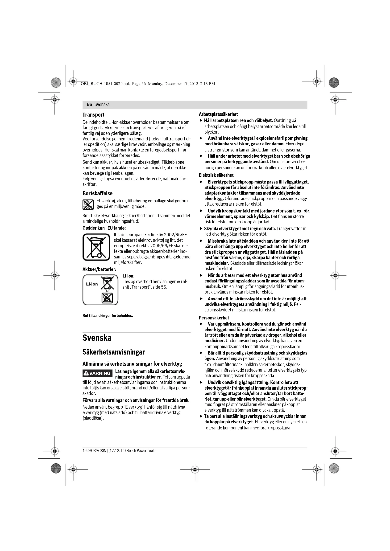 OBJ_BUCH-1051-002.book Page 55 Monday, December 17, 2012 2:13 PM56 | Svenska 1 609 92A 00N | (17.12.12) Bosch Power Tools Transport De indeholdte Li-Ion-akkuer overholder bestemmelserne om farligt gods. Akkuerne kan transporteres af brugeren på of- fentlig vej uden yderligere pålæg. Ved forsendelse gennem tredjemand (f.eks.: lufttransport el- ler spedition) skal særlige krav vedr. emballage og mærkning overholdes. Her skal man kontakte en faregodsekspert, før forsendelsesstykket forberedes. Send kun akkuer, hvis huset er ubeskadiget. Tilklæb åbne kontakter og indpak akkuen på en sådan måde, at den ikke kan bevæge sig i emballagen. Følg venligst også eventuelle, videreførende, nationale for- skrifter. Bortskaffelse El-værktøj, akku, tilbehør og emballage skal genbru- ges på en miljøvenlig måde. Smid ikke el-værktøj og akkuer/batterier ud sammen med det almindelige husholdningsaffald! Gælder kun i EU-lande: Iht. det europæiske direktiv 2002/96/EF skal kasseret elektroværktøj og iht. det europæiske direktiv 2006/66/EF skal de- fekte eller opbrugte akkuer/batterier ind- samles separat og genbruges iht. gældende miljøforskrifter. Akkuer/batterier: Li-Ion: Læs og overhold henvisningerne i af- snit „Transport“, side 56. Ret til ændringer forbeholdes. Svenska Säkerhetsanvisningar Allmänna säkerhetsanvisningar för elverktyg Läs noga igenom alla säkerhetsanvis- ningar och instruktioner. Fel som uppstår till följd av att säkerhetsanvisningarna och instruktionerna inte följts kan orsaka elstöt, brand och/eller allvarliga person- skador. Förvara alla varningar och anvisningar för framtida bruk. Nedan använt begrepp ”Elverktyg” hänför sig till nätdrivna elverktyg (med nätsladd) och till batteridrivna elverktyg (sladdlösa). Arbetsplatssäkerhet Håll arbetsplatsen ren och välbelyst. Oordning på arbetsplatsen och dåligt belyst arbetsområde kan leda till olyckor. Använd inte elverktyget i explosionsfarlig omgivning med brännbara vätskor, gaser eller damm. Elverktygen alstrar gnistor som kan antända dammet eller gaserna. Håll under arbetet med elverktyget barn och obehöriga personer på betryggande avstånd. Om du störs av obe- höriga personer kan du förlora kontrollen över elverktyget. Elektrisk säkerhet Elverktygets stickpropp måste passa till vägguttaget. Stickproppen får absolut inte förändras. Använd inte adapterkontakter tillsammans med skyddsjordade elverktyg. Oförändrade stickproppar och passande vägg- uttag reducerar risken för elstöt. Undvik kroppskontakt med jordade ytor som t. ex. rör, värmeelement, spisar och kylskåp. Det finns en större risk för elstöt om din kropp är jordad. Skydda elverktyget mot regn och väta. Tränger vatten in i ett elverktyg ökar risken för elstöt. Missbruka inte nätsladden och använd den inte för att bära eller hänga upp elverktyget och inte heller för att dra stickproppen ur vägguttaget. Håll nätsladden på avstånd från värme, olja, skarpa kanter och rörliga maskindelar. Skadade eller tilltrasslade ledningar ökar risken för elstöt. När du arbetar med ett elverktyg utomhus använd endast förlängningssladdar som är avsedda för utom- husbruk. Om en lämplig förlängningssladd för utomhus- bruk används minskar risken för elstöt. Använd ett felströmsskydd om det inte är möjligt att undvika elverktygets användning i fuktig miljö. Fel- strömsskyddet minskar risken för elstöt. Personsäkerhet Var uppmärksam, kontrollera vad du gör och använd elverktyget med förnuft. Använd inte elverktyg när du är trött eller om du är påverkad av droger, alkohol eller mediciner. Under användning av elverktyg kan även en kort ouppmärksamhet leda till allvarliga kroppsskador. Bär alltid personlig skyddsutrustning och skyddsglas- ögon. Användning av personlig skyddsutrustning som t.ex. dammfiltermask, halkfria säkerhetsskor, skydds- hjälm och hörselskydd reducerar alltefter elverktygets typ och användning risken för kroppsskada. Undvik oavsiktlig igångsättning. Kontrollera att elverktyget är frånkopplat innan du ansluter stickprop- pen till vägguttaget och/eller ansluter/tar bort batte- riet, tar upp eller bär elverktyget. Om du bär elverktyget med fingret på strömställaren eller ansluter påkopplat elverktyg till nätströmmen kan olycka uppstå. Ta bort alla inställningsverktyg och skruvnycklar innan du kopplar på elverktyget. Ett verktyg eller en nyckel i en roterande komponent kan medföra kroppsskada. VARNING OBJ_BUCH-1051-002.book Page 56 Monday, December 17, 2012 2:13 PMSvenska | 57 Bosch Power Tools 1 609 92A 00N | (17.12.12) Undvik onormala kroppsställningar. Se till att du står stadigt och håller balansen. I detta fall kan du lättare kon- trollera elverktyget i oväntade situationer. Bär lämpliga arbetskläder. Bär inte löst hängande klä- der eller smycken. Håll håret, kläderna och handskarna på avstånd från rörliga delar. Löst hängande kläder, långt hår och smycken kan dras in av roterande delar. När elverktyg används med dammutsugnings- och -upp- samlingsutrustning, se till att dessa är rätt monterade och används på korrekt sätt. Användning av damm- utsugning minskar de risker damm orsakar. Korrekt användning och hantering av elverktyg Överbelasta inte elverktyget. Använd för aktuellt arbete avsett elverktyg. Med ett lämpligt elverktyg kan du arbeta bättre och säkrare inom angivet effektområde. Ett elverktyg med defekt strömställare får inte längre användas. Ett elverktyg som inte kan kopplas in eller ur är farligt och måste repareras. Dra stickproppen ur vägguttaget och/eller ta bort bat- teriet innan inställningar utförs, tillbehörsdelar byts ut eller elverktyget lagras. Denna skyddsåtgärd förhindrar oavsiktlig inkoppling av elverktyget. Förvara elverktygen oåtkomliga för barn. Låt elverkty- get inte användas av personer som inte är förtrogna med dess användnin