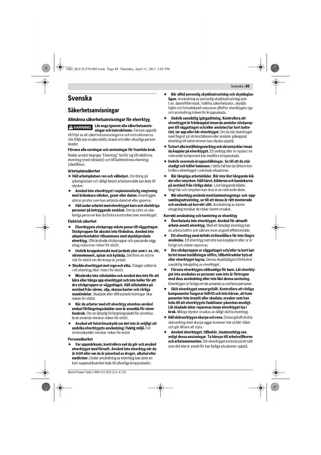 af skruelængden med gevindets kernedia- meter. Vedligeholdelse og service Vedligeholdelse og rengøring Tag akkuen ud af el-værktøjet, før der arbejdes på el-værktøjet (f.eks. vedligeholdelse, værktøjsskift osv.) samt før det transporteres og lægges til opbeva- ring. Utilsigtet aktivering af start-stop-kontakten er for- bundet med kvæstelsesfare. El-værktøj og el-værktøjets ventilationsåbninger skal altid holdes rene for at sikre et godt og sikkert arbejde. Når akkuen ikke fungerer mere, bedes du kontakte et autori- seret serviceværksted for Bosch el-værktøj. Kundeservice og brugerrådgivning Kundeservice besvarer dine spørgsmål vedr. reparation og vedligeholdelse af dit produkt samt reservedele. Eksplosions- tegninger og informationer om reservedele findes også under: www.bosch-pt.com Bosch brugerrådgivningsteamet vil gerne hjælpe dig med at besvare spørgsmål vedr. vores produkter og deres tilbehør. El-værktøjets 10-cifrede typenummer (se typeskilt) skal altid angives ved forespørgsler og bestilling af reservedele. Dansk Bosch Service Center Telegrafvej 3 2750 Ballerup Tlf. Service Center: 44898855 Fax: 44898755 E-Mail: vaerktoej@dk.bosch.com Transport De indeholdte Li-Ion-akkuer overholder bestemmelserne om farligt gods. Akkuerne kan transporteres af brugeren på of- fentlig vej uden yderligere pålæg. Ved forsendelse gennem tredjemand (f.eks.: lufttransport el- ler spedition) skal særlige krav vedr. emballage og mærkning overholdes. Her skal man kontakte en faregodsekspert, før forsendelsesstykket forberedes. Send kun akkuer, hvis huset er ubeskadiget. Tilklæb åbne kontakter og indpak akkuen på en sådan måde, at den ikke kan bevæge sig i emballagen. Følg venligst også eventuelle, videreførende, nationale for- skrifter. Bortskaffelse El-værktøj, akku, tilbehør og emballage skal genbru- ges på en miljøvenlig måde. Smid ikke el-værktøj og akkuer/batterier ud sammen med det almindelige husholdningsaffald! Gælder kun i EU-lande: Iht. det europæiske direktiv 2012/19/EU skal kasseret elektroværktøj og iht. det europæiske direktiv 2006/66/EF skal de- fekte eller opbrugte akkuer/batterier ind- samles separat og genbruges iht. gældende miljøforskrifter. Akkuer/batterier: Li-Ion: Læs og overhold henvisningerne i af- snit „Transport“, side 48. Ret til ændringer forbeholdes. LED Kapacitet Konstant lys 3 x grøn ≥ 2/3 Konstant lys 2 x grøn ≥1/3 Konstant lys 1 x grøn < 1/3 Blinklys 1 x grøn Reserve OBJ_BUCH-970-005.book Page 48 Thursday, April 11, 2013 1:02 PMSvenska | 49 Bosch Power Tools 2 609 141 052 | (11.4.13) Svenska Säkerhetsanvisningar Allmänna säkerhetsanvisningar för elverktyg Läs noga igenom alla säkerhetsanvis- ningar och instruktioner. Fel som uppstår till följd av att säkerhetsanvisningarna och instruktionerna inte följts kan orsaka elstöt, brand och/eller allvarliga person- skador. Förvara alla varningar och anvisningar för framtida bruk. Nedan använt begrepp ”Elverktyg” hänför sig till nätdrivna elverktyg (med nätsladd) och till batteridrivna elverktyg (sladdlösa). Arbetsplatssäkerhet Håll arbetsplatsen ren och välbelyst. Oordning på arbetsplatsen och dåligt belyst arbetsområde kan leda till olyckor. Använd inte elverktyget i explosionsfarlig omgivning med brännbara vätskor, gaser eller damm. Elverktygen alstrar gnistor som kan antända dammet eller gaserna. Håll under arbetet med elverktyget barn och obehöriga personer på betryggande avstånd. Om du störs av obe- höriga personer kan du förlora kontrollen över elverktyget. Elektrisk säkerhet Elverktygets stickpropp måste passa till vägguttaget. Stickproppen får absolut inte förändras. Använd inte adapterkontakter tillsammans med skyddsjordade elverktyg. Oförändrade stickproppar och passande vägg- uttag reducerar risken för elstöt. Undvik kroppskontakt med jordade ytor som t. ex. rör, värmeelement, spisar och kylskåp. Det finns en större risk för elstöt om din kropp är jordad. Skydda elverktyget mot regn och väta. Tränger vatten in i ett elverktyg ökar risken för elstöt. Missbruka inte nätsladden och använd den inte för att bära eller hänga upp elverktyget och inte heller för att dra stickproppen ur vägguttaget. Håll nätsladden på avstånd från värme, olja, skarpa kanter och rörliga maskindelar. Skadade eller tilltrasslade ledningar ökar risken för elstöt. När du arbetar med ett elverktyg utomhus använd endast förlängningssladdar som är avsedda för utom- husbruk. Om en lämplig förlängningssladd för utomhus- bruk används minskar risken för elstöt. Använd ett felströmsskydd om det inte är möjligt att undvika elverktygets användning i fuktig miljö. Fel- strömsskyddet minskar risken för elstöt. Personsäkerhet Var uppmärksam, kontrollera vad du gör och använd elverktyget med förnuft. Använd inte elverktyg när du är trött eller om du är påverkad av droger, alkohol eller mediciner. Under användning av elverktyg kan även en kort ouppmärksamhet leda till allvarliga kroppsskador. Bär alltid personlig skyddsutrustning och skyddsglas- ögon. Användning av personlig skyddsutrustning som t.ex. dammfiltermask, halkfria säkerhetsskor, skydds- hjälm och hörselskydd reducerar alltefter elverktygets typ och användning risken för kroppsskada. Undvik oavsiktlig igångsättning. Kontrollera att elverktyget är frånkopplat innan du ansluter stickprop- pen till vägguttaget och/eller ansluter/tar bort batte- riet, tar upp eller bär elverktyget. Om du bär elverktyget med fingret på strömställaren eller ansluter påkopplat elverktyg till nätströmmen kan olycka uppstå. Ta bort alla inställningsverktyg och skruvnycklar innan du kopplar på elverktyget. Ett verktyg eller en nyckel i en roterande komponent kan medföra kroppsskada. Undvik onormala kroppsställningar. Se till att du står stadigt och håller balansen. I detta fall kan du lättare kon- trollera elv