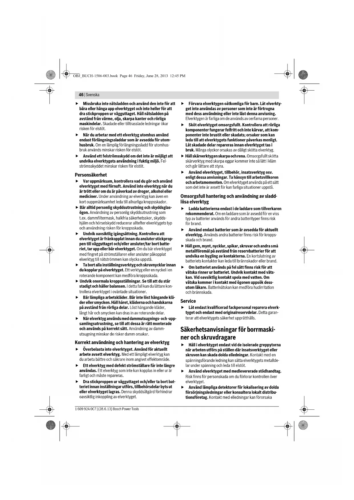 Samlet værdi for svingning Henk Becker Executive Vice President Engineering Helmut Heinzelmann Head of Product Certification PT/ETM9 Symbol Betydning OBJ_BUCH-1586-003.book Page 43 Friday, June 28, 2013 12:45 PM44 | Dansk 1 609 92A 0C7 | (28.6.13) Bosch Power Tools Det angivede svingningsniveau repræsenterer de væsentlige anvendelser af el-værktøjet. Hvis el-værktøjet dog anvendes til andre formål, med afvigende indsatsværktøj eller utilstræk- kelig vedligeholdelse, kan svingningsniveauet afvige. Dette kan føre til en betydelig forøgelse af svingningsbelastningen i hele arbejdstidsrummet. Til en nøjagtig vurdering af svingningsbelastningen bør der også tages højde for de tider, i hvilke værktøjet er slukket eller godt nok kører, men rent faktisk ikke anvendes. Dette kan fø- re til en betydelig reduktion af svingningsbelastningen i hele arbejdstidsrummet. Fastlæg ekstra sikkerhedsforanstaltninger til beskyttelse af brugeren mod svingningers virkning som f.eks.: Vedligehol- delse af el-værktøj og indsatsværktøj, holde hænder varme, organisation af arbejdsforløb. Montering og drift Af efterfølgende tabel fremgår det, hvordan der skal handles i forbindelse med montering og brug af el-værktøjet. Instrukserne til hvordan der skal handles vises i det angivede billede. Instrukserne er kombineret forskelligt afhængigt af, hvad der skal laves. Overhold sikkerhedsinstrukserne. Handlingsmål Fig. Vær opmærksom på følgende Side Akku tages ud 1 156 Isæt akku 2 156 Monter indsatsværktøj 3 156 Indstil drejeretning 4 157 Vælg drejningsmoment 5 157 Vælg borestilling 6 158 Mekanisk gearvalg 7 158 OBJ_BUCH-1586-003.book Page 44 Friday, June 28, 2013 12:45 PMSvenska | 45 Bosch Power Tools 1 609 92A 0C7 | (28.6.13) Vedligeholdelse og rengøring El-værktøj og el-værktøjets ventilationsåbninger skal altid holdes rene for at sikre et godt og sikkert arbejde. Efter brug: Rengør altid indsatsværktøjet, værktøjsholderen og ventilationsåbningerne på el-værktøjet samt ventilations- åbningerne på akkuen. Kundeservice og brugerrådgivning Kundeservice besvarer dine spørgsmål vedr. reparation og vedligeholdelse af dit produkt samt reservedele. Eksplosions- tegninger og informationer om reservedele findes også un- der: www.bosch-pt.com Bosch brugerrådgivningsteamet vil gerne hjælpe dig med at besvare spørgsmål vedr. vores produkter og deres tilbehør. El-værktøjets 10-cifrede typenummer (se typeskilt) skal altid angives ved forespørgsler og bestilling af reservedele. Dansk Bosch Service Center Telegrafvej 3 2750 Ballerup Tlf. Service Center: 44898855 Fax: 44898755 E-Mail: vaerktoej@dk.bosch.com Transport De indeholdte Li-Ion-akkuer overholder bestemmelserne om farligt gods. Akkuerne kan transporteres af brugeren på of- fentlig vej uden yderligere pålæg. Ved forsendelse gennem tredjemand (f.eks.: lufttransport el- ler spedition) skal særlige krav vedr. emballage og mærkning overholdes. Her skal man kontakte en faregodsekspert, før forsendelsesstykket forberedes. Send kun akkuer, hvis huset er ubeskadiget. Tilklæb åbne kontakter og indpak akkuen på en sådan måde, at den ikke kan bevæge sig i emballagen. Følg venligst også eventuelle, videreførende, nationale for- skrifter. Bortskaffelse El-værktøj, akku, tilbehør og emballage skal genbru- ges på en miljøvenlig måde. Smid ikke el-værktøj og akkuer/batterier ud sammen med det almindelige husholdningsaffald! Gælder kun i EU-lande: Iht. det europæiske direktiv 2012/19/EU skal kasseret elektroværktøj og iht. det europæiske direktiv 2006/66/EF skal de- fekte eller opbrugte akkuer/batterier ind- samles separat og genbruges iht. gældende miljøforskrifter. Ret til ændringer forbeholdes. Svenska Allmänna säkerhetsanvisningar för elverktyg Läs noga igenom alla säkerhetsanvis- ningar och instruktioner. Fel som uppstår till följd av att säkerhetsanvisningarna och instruktionerna inte följts kan orsaka elstöt, brand och/eller allvarliga person- skador. Förvara alla varningar och anvisningar för framtida bruk. Nedan använt begrepp ”Elverktyg” hänför sig till nätdrivna elverktyg (med nätsladd) och till batteridrivna elverktyg (sladdlösa). Arbetsplatssäkerhet Håll arbetsplatsen ren och välbelyst. Oordning på arbetsplatsen och dåligt belyst arbetsområde kan leda till olyckor. Använd inte elverktyget i explosionsfarlig omgivning med brännbara vätskor, gaser eller damm. Elverktygen alstrar gnistor som kan antända dammet eller gaserna. Håll under arbetet med elverktyget barn och obehöriga personer på betryggande avstånd. Om du störs av obe- höriga personer kan du förlora kontrollen över elverktyget. Elektrisk säkerhet Elverktygets stickpropp måste passa till vägguttaget. Stickproppen får absolut inte förändras. Använd inte adapterkontakter tillsammans med skyddsjordade elverktyg. Oförändrade stickproppar och passande vägg- uttag reducerar risken för elstöt. Undvik kroppskontakt med jordade ytor som t. ex. rör, värmeelement, spisar och kylskåp. Det finns en större risk för elstöt om din kropp är jordad. Skydda elverktyget mot regn och väta. Tränger vatten in i ett elverktyg ökar risken för elstöt. Tænd/sluk 8 158 Valg af tilbehør – 159 Handlingsmål Fig. Vær opmærksom på følgende Side VARNING OBJ_BUCH-1586-003.book Page 45 Friday, June 28, 2013 12:45 PM46 | Svenska 1 609 92A 0C7 | (28.6.13) Bosch Power Tools Missbruka inte nätsladden och använd den inte för att bära eller hänga upp elverktyget och inte heller för att dra stickproppen ur vägguttaget. Håll nätsladden på avstånd från värme, olja, skarpa kanter och rörliga maskindelar. Skadade eller tilltrasslade ledningar ökar risken för elstöt. När du arbetar med ett elverktyg utomhus använd endast förlängningssladdar som är avsedda för utom- husbruk. Om en lämplig förlängningssladd för utomhus- bruk används minskar risken för elstöt. Använd ett fe