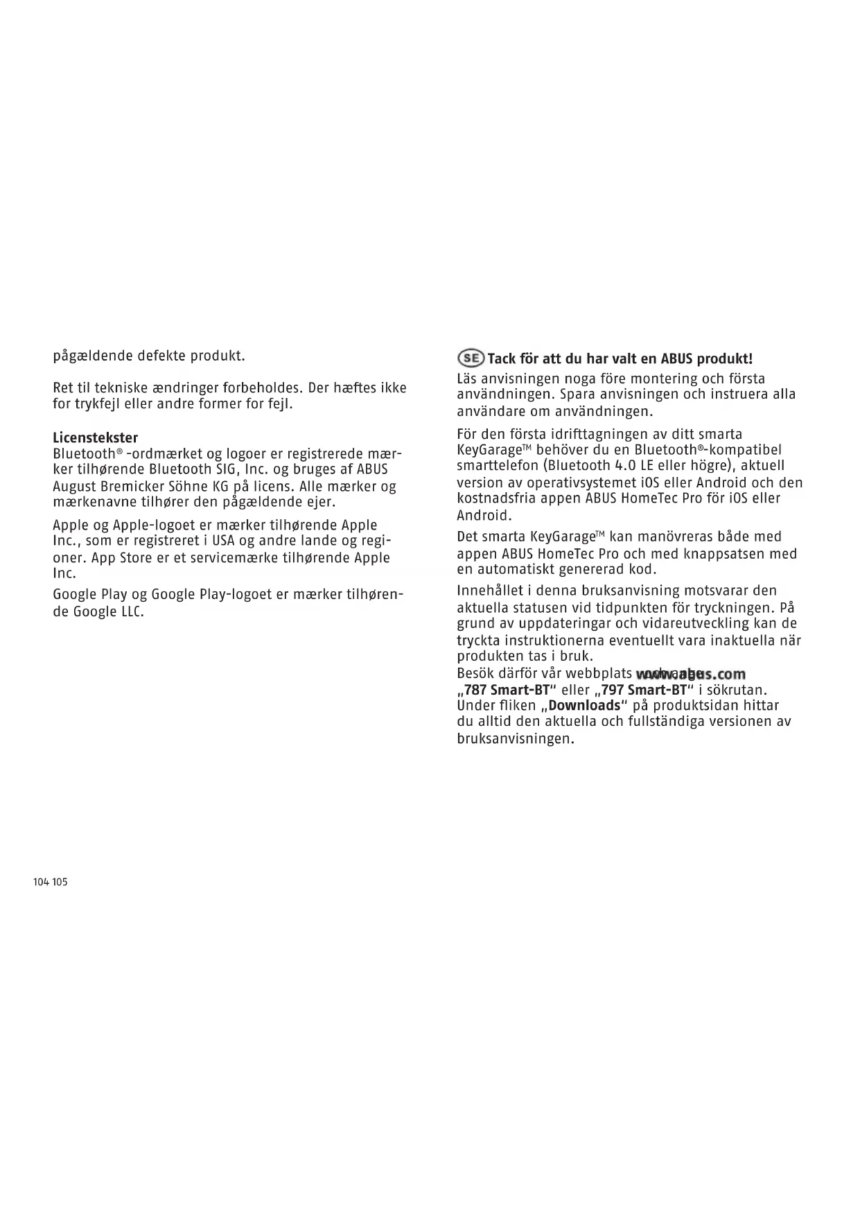 Tekniska data Mått 83 x 120 x 63 mm Vikt ca 883 g Förvaringsutrymme för upp till 20 nycklar (standardnycklar till ytterdörrar) eller upp till 30 plastkort (kredit- kortformat) eller hela nyckelknippen Dristemperaturområde -10°C till +50°C Radiofrekvens 2,402 GHz - 2,480 GHz Maximal utstrålad eekt < 10dBm eirp Kryptering AES-128-Bit Försäkran om överensstämmelse Härmed försäkrar ABUS August Bremicker Söhne KG att den trådlösa anläggningen 787 / 797 Smart-BT uppfyller kraven i direktiven 2014/53/EU och 2011/65/EU. EU-försäkran om överensstämmelse nns att läsa i sin helhet på: docs.abus.com. Avfallshantering Den här produkten innehåller värdefulla råmaterial. Släng produkten i enlighet med gällande lagstadgade bestämmelser vid slutet av dess livslängd. Elektriska apparater och batterier, varken uppladdningsbara eller engångs, får inte slängas i hushållssoporna. Bortskaningen måste göras i enlighet med direktiv 2012/19/EU om avfall som utgörs av eller innehåller elektrisk och elektronisk utrustning (WEEE) resp. i enlighet med 2006/66/EG om batterier och ackumulatorer och förbrukade batterier och ackumulatorer. Källsortera förpackningen. Släng papp och kartong, folier och plastdelar i återvinningen. Vid frågor ska du vända dig till den lokala myndighe- ten som är ansvarig för bortskaning och återvinning. Du kan få information om ställen att lämna in dina förbrukade enheter från den lokala kommun- eller stadsförvaltningen, det lokala återvinningsföretaget eller din återförsäljare. Garanti ABUS-produkter är noggrant utformade, tillverkade och testade enligt gällande föreskrier. Garantin omfattar bara sådana brister som beror på material- eller tillverkningsfel. Finns det bevisligen material- eller tillverkningsfel, så reparerar eller ersätter ABUS produkten eer egen bedömning. Garantin upphör i så fall i och med att den ursprungliga garantitiden går ut. Ytterligare anspråk är uttryckligen uteslutna. ABUS ansvarar inte för brister eller skador som beror på yttre påverkan (t.ex. transport, våldsanvändning), felanvändning, normal förslitning eller att man WEEE-Reg.-Nr. DE79663011118 119 inte följt anvisningarna i bruksanvisningen. Bifoga originalkvittot med inköpsdatum och en kort, skrilig felbeskrivning av felet på den reklamerade produkten vid garantiärenden. Tekniska ändringar är förbehållna. För tryckfel och misstag tas inget ansvar. Licenstexter Bluetooth