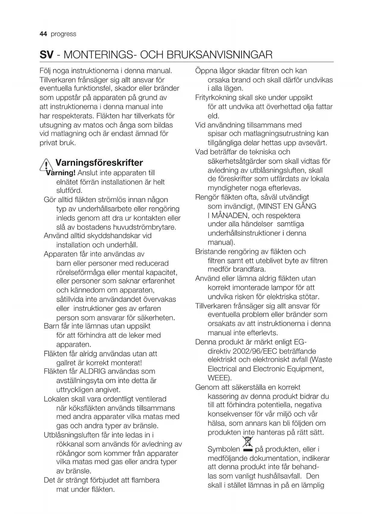 Följ noga instruktionerna i denna manual. Tillverkaren frånsäger sig allt ansvar för eventuella funktionsfel, skador eller bränder som uppstår på apparaten på grund av att instruktionerna i denna manual inte har respekterats. Fläkten har tillverkats för utsugning av matos och ånga som bildas vid matlagning och är endast ämnad för privat bruk. Varningsföreskrifter Varning! Anslut inte apparaten till elnätet förrän installationen är helt slutförd. Gör alltid fläkten strömlös innan någon typ av underhållsarbete eller rengöring inleds genom att dra ur kontakten eller slå av bostadens huvudströmbrytare. Använd alltid skyddshandskar vid installation och underhåll. Apparaten får inte användas av barn eller personer med reducerad rörelseförmåga eller mental kapacitet, eller personer som saknar erfarenhet och kännedom om apparaten, såtillvida inte användandet övervakas eller instruktioner ges av erfaren person som ansvarar för säkerheten. Barn får inte lämnas utan uppsikt för att förhindra att de leker med apparaten. Fläkten får alridg användas utan att gallret är korrekt monterat! Fläkten får ALDRIG användas som avställningsyta om inte detta är uttryckligen angivet. Lokalen skall vara ordentligt ventilerad när köksfläkten används tillsammans med andra apparater vilka matas med gas och andra typer av bränsle. Utblåsningsluften får inte ledas in i rökkanal som används för avledning av rökångor som kommer från apparater vilka matas med gas eller andra typer av bränsle. Det är strängt förbjudet att flambera mat under fläkten. Öppna lågor skadar filtren och kan orsaka brand och skall därför undvikas i alla lägen. Frityrkokning skall ske under uppsikt för att undvika att överhettad olja fattar eld. Vid användning tillsammans med spisar och matlagningsutrustning kan tillgängliga delar hettas upp avsevärt. Vad beträffar de tekniska och säkerhetsåtgärder som skall vidtas för avledning av utblåsningsluften, skall de föreskrifter som utfärdats av lokala myndigheter noga efterlevas. Rengör fläkten ofta, såväl utvändigt som invändigt, (MINST EN GÅNG I MÅNADEN, och respektera under alla händelser samtliga underhållsinstruktioner i denna manual). Bristande rengöring av fläkten och filtren samt ett uteblivet byte av filtren medför brandfara. Använd eller lämna aldrig fläkten utan korrekt imonterade lampor för att undvika risken för elektriska stötar. Tillverkaren frånsäger sig allt ansvar för eventuella problem eller bränder som orsakats av att instruktionerna i denna manual inte efterlevts. Denna produkt är märkt enligt EG- direktiv 2002/96/EEC beträffande elektriskt och elektroniskt avfall (Waste Electrical and Electronic Equipment, WEEE). Genom att säkerställa en korrekt kassering av denna produkt bidrar du till att förhindra potentiella, negativa konsekvenser för vår miljö och vår hälsa, som annars kan bli följden om produkten inte hanteras på rätt sätt. Symbolen på produkten, eller i medföljande dokumentation, indikerar att denna produkt inte får behand- las som vanligt hushållsavfall. Den skall i stället lämnas in på en lämpligprogress 45 uppsamlingsplats för återvinning av elektrisk och elektronisk utrustning. Produkten måste kasseras enligt loka- la miljöbestämmelser för avfallshanter- ing. För mer information om hantering, återvinning och återanvändning av denna produkt, var god kontakta de lokala myndigheterna, ortens sophanteringstjänst eller butiken där produkten inhandlades. Användning Fläkten har tillverkats för att användas som utsugningsversion med utvändig evakuer- ing eller som fi lterversion med intern återcirkulation . Installation Produkt med hög vikt. För fl yttning och installation av fl äktkåpan krävs minst två personer. Minsta tillåtna avstånd mellan kokkärlens stödyta på spishällen och köksfl äktes underkant är 50cm om det är frågan om en elektrisk spis och 65cm om det är frågan om gasspis eller kombinerad gashäll. Om spishällens instruktioner anger ett större avstånd skall detta respekteras. Nätspänningen skall motsvara spänningen som anges på märkplåten som sitter inne i fl äkten. Om fl äkten är utrustad med stickkontakt skall denna anslutas till ett uttag som är lättillgängligt även efter installationen och som uppfyller gällande föreskrifter. I det fall fl äkten saknar stickkontakt (direktanslutning till nätet), eller om uttaget är placerat på en svåråtkomlig plats skall en godkänd tvåpolig strömbrytare installeras som garanterar en fullkomlig frånkoppling från nätet i samband med överspänningsklass III, i enlighet med installationsbestämmelserna. Varning! kontrollera innan fläktens krets ansluts med nätspänningen att den fungerar korrekt och är korrekt monterad. Funktion Fläkten är utrustad med en manöverpanel med en hastighetskontroll och en strömbrytare för spishällens belysning. 1 2-3
