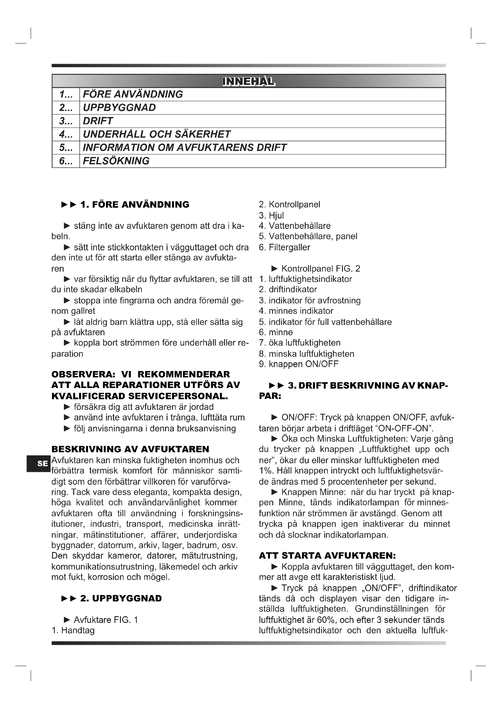 ► 1. FöRE ANVäNDNING ► stäng inte av avfuktaren genom att dra i ka- beln. ► sätt inte stickkontakten i vägguttaget och dra den inte ut för att starta eller stänga av avfukta- ren ► var försiktig när du yttar avfuktaren, se till att du inte skadar elkabeln ► stoppa inte ngrarna och andra föremål ge- nom gallret ► låt aldrig barn klättra upp, stå eller sätta sig på avfuktaren ► koppla bort strömmen före underhåll eller re- paration ObSERVERA: VI REKOMMENDERAR ATT ALLA REPARATIONER UTFöRS AV KVALIFICERAD SERVICEPERSONAL. ► försäkra dig att avfuktaren är jordad ► använd inte avfuktaren i trånga, lufttäta rum ► följ anvisningarna i denna bruksanvisning