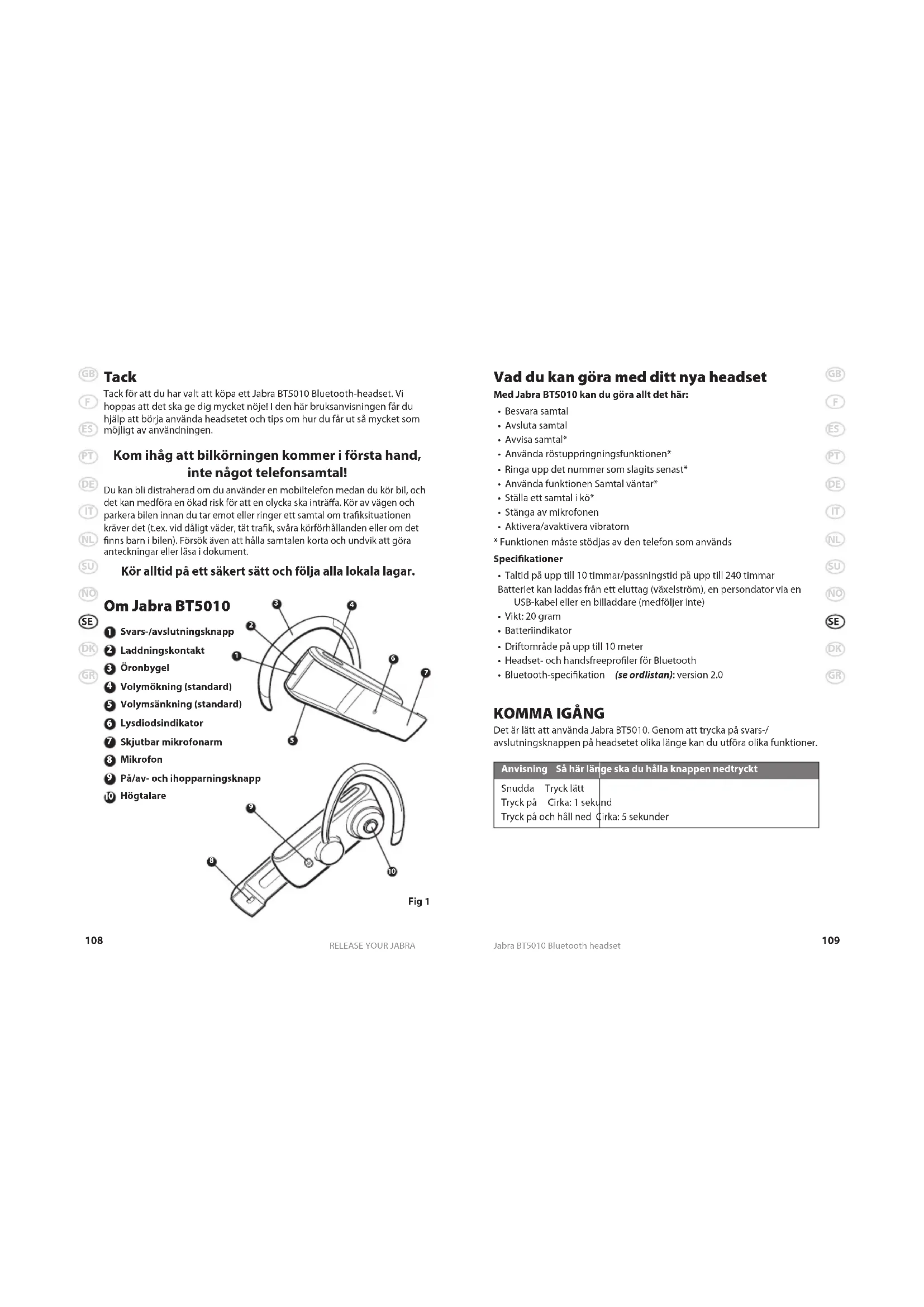 Det är lätt att använda Jabra BT5010. Genom att trycka på svars-/ avslutningsknappen på headsetet olika länge kan du utföra olika funktioner. Anvisning Så här länge ska du hålla knappen nedtryckt Snudda Tryck lätt Tryck på Cirka: 1 sekund Tryck på och håll ned Cirka: 5 sekunder Tack Tack för att du har valt att köpa ett Jabra BT5010 Bluetooth-headset. Vi hoppas att det ska ge dig mycket nöje! I den här bruksanvisningen får du hjälp att börja använda headsetet och tips om hur du får ut så mycket som möjligt av användningen. Kom ihåg att bilkörningen kommer i första hand, inte något telefonsamtal! Du kan bli distraherad om du använder en mobiltelefon medan du kör bil, och det kan medföra en ökad risk för att en olycka ska inträa. Kör av vägen och parkera bilen innan du tar emot eller ringer ett samtal om traksituationen kräver det (t.ex. vid dåligt väder, tät trak, svåra körförhållanden eller om det nns barn i bilen). Försök även att hålla samtalen korta och undvik att göra anteckningar eller läsa i dokument. Kör alltid på ett säkert sätt och följa alla lokala lagar. Om Jabra BT5010