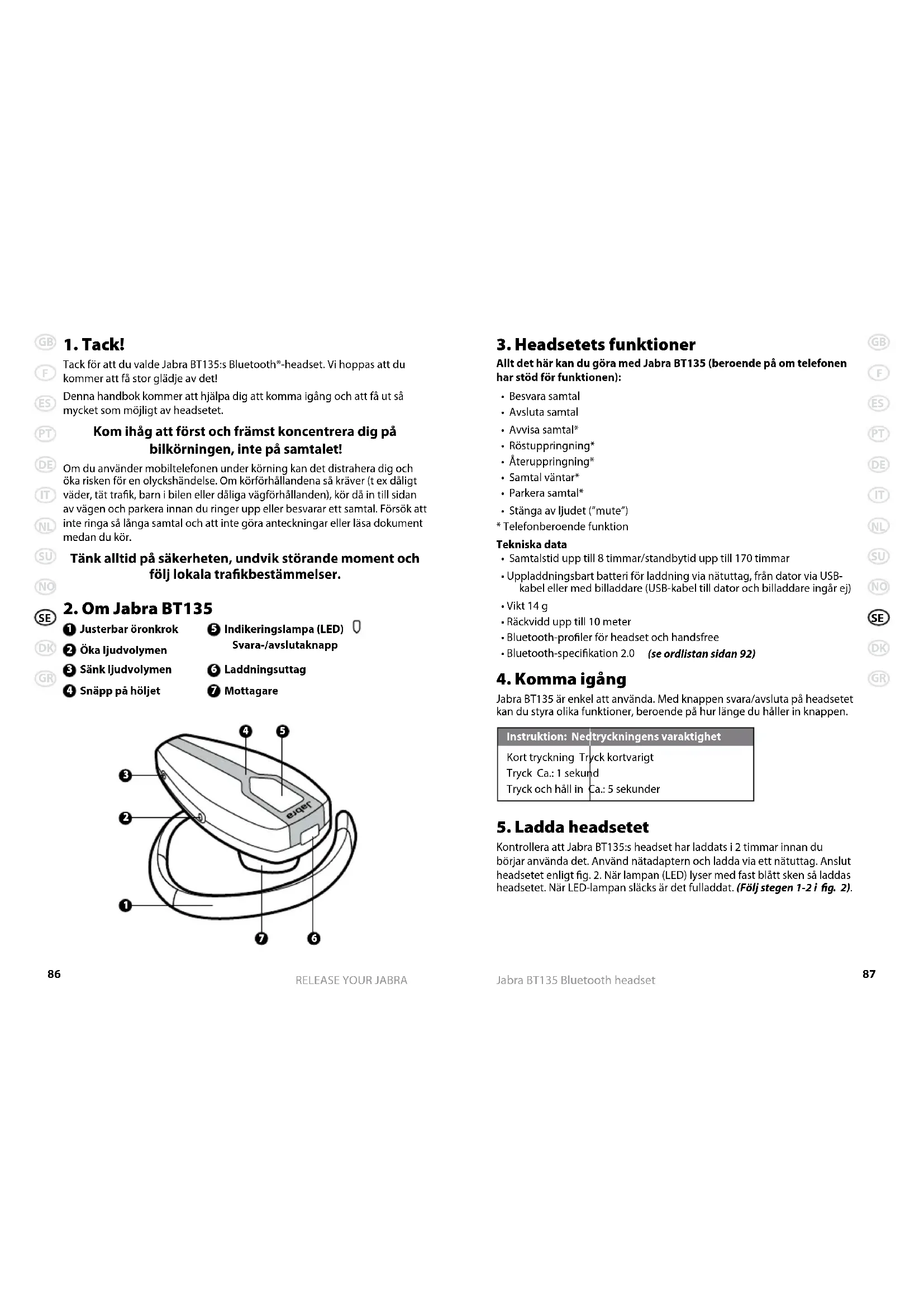 Tack för att du valde Jabra BT135:s Bluetooth®-headset. Vi hoppas att du kommer att få stor glädje av det! Denna handbok kommer att hjälpa dig att komma igång och att få ut så mycket som möjligt av headsetet. Kom ihåg att först och främst koncentrera dig på bilkörningen, inte på samtalet! Om du använder mobiltelefonen under körning kan det distrahera dig och öka risken för en olyckshändelse. Om körförhållandena så kräver (t ex dåligt väder, tät trak, barn i bilen eller dåliga vägförhållanden), kör då in till sidan av vägen och parkera innan du ringer upp eller besvarar ett samtal. Försök att inte ringa så långa samtal och att inte göra anteckningar eller läsa dokument medan du kör. Tänk alltid på säkerheten, undvik störande moment och följ lokala trakbestämmelser.