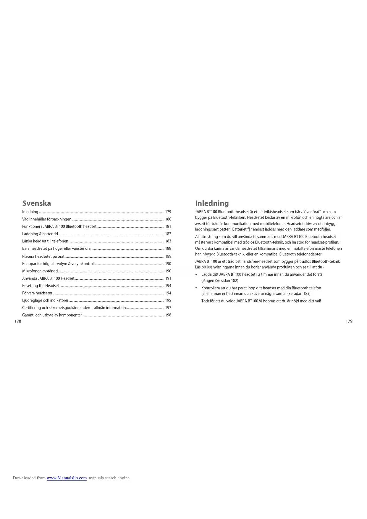 JABRA (GN Netcom) ei ole vastuussa mistään kuljetuksen aikana tapahtuvista menetyksistä tai vahingoista. JABRA (GN Netcom) -tuotteiden kaikki takuut raukeavat, jos tuotteita korjaa valtuuttamaton, ulkopuolinen henkilö. Downloaded from www.Manualslib.com manuals search engine179 Inledning JABRA BT100 Bluetooth-headset är ett lättviktsheadset som bärs "över örat" och som bygger på Bluetooth-tekniken. Headsetet består av en mikrofon och en högtalare och är avsett för trådlös kommunikation med mobiltelefoner. Headsetet drivs av ett inbyggt laddningsbart batteri. Batteriet får endast laddas med den laddare som medföljer. All utrustning som du vill använda tillsammans med JABRA BT100 Bluetooth headset måste vara kompatibel med trådlös Bluetooth-teknik, och ha stöd för headset-profilen. Om du ska kunna använda headsetet tillsammans med en mobiltelefon måste telefonen har inbyggd Bluetooth-teknik, eller en kompatibel Bluetooth telefonadapter. JABRA BT100 är ett trådlöst handsfree-headset som bygger på trådlös Bluetooth-teknik. Läs bruksanvisningarna innan du börjar använda produkten och se till att du -
