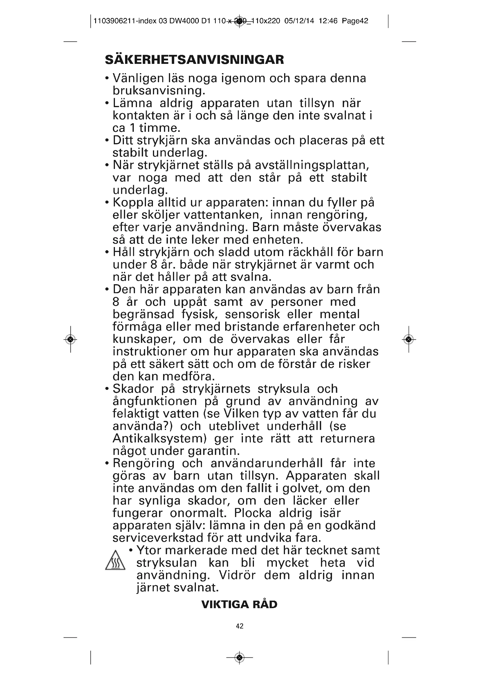 1103906211-index 03 DW4000 D1 110 x 220_110x220 05/12/14 12:46 Page42• Elinstallationens märkspänning ska överensstämma med strykjärnets märkspänning