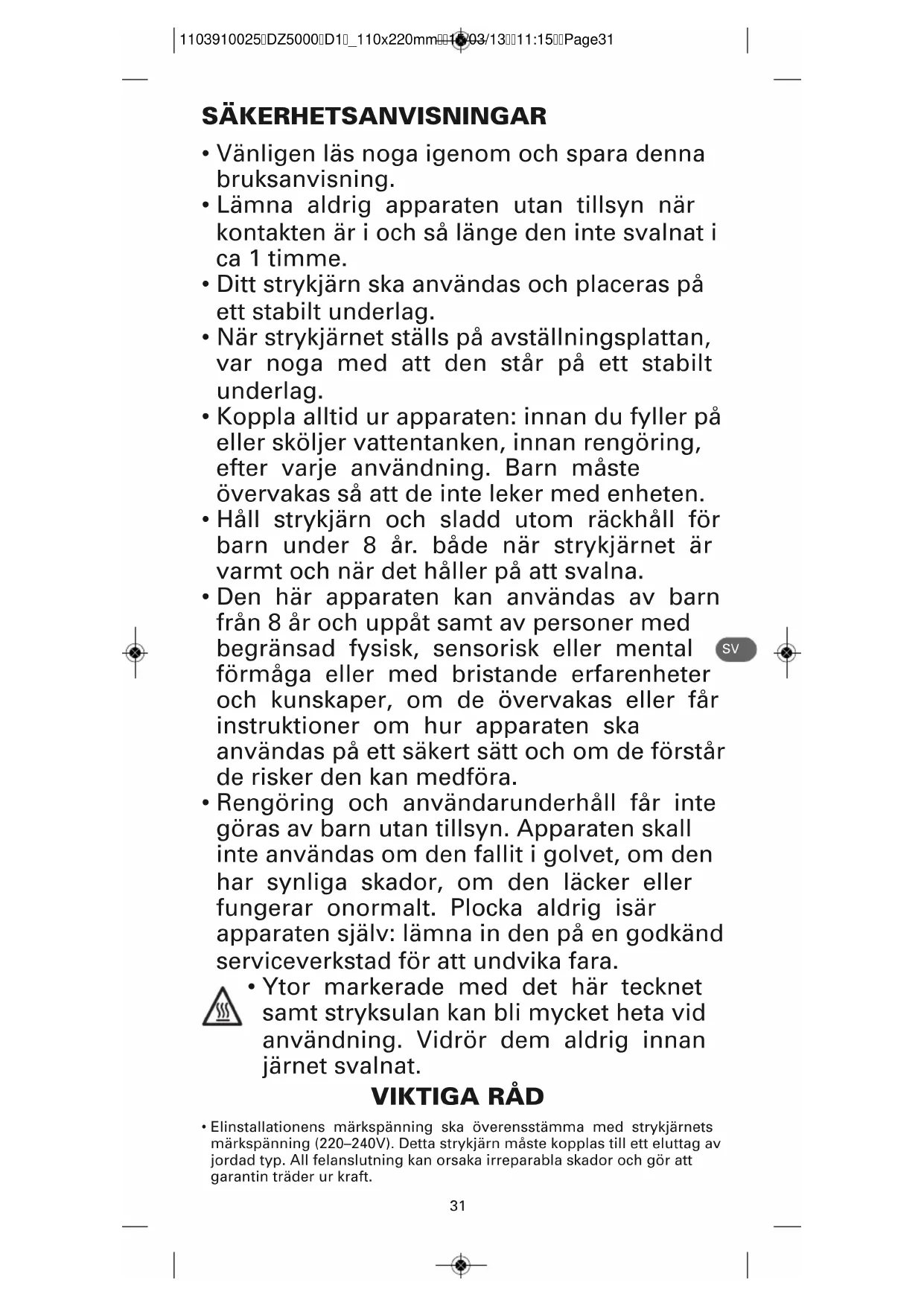 - Håll strykjärn och sladd utom räckhåll för barn under 8 år. både när strykjärnet är varmt och när det håller på att svalna.
