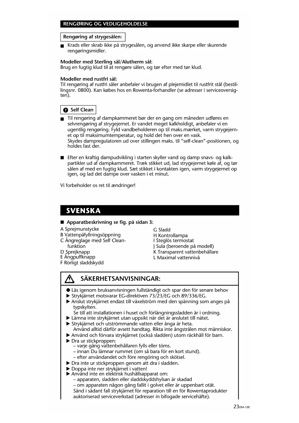 Repa eller skrapa inte på stryksulan och använd inga skarpa eller slitande ren- göringsmedel. Modeller med Sterlingsula/Aluthermsula: Rengör sulan med en lätt fuktad trasa och torka den sedan torr. Modeller med rostfri stryksula: För rengöring av den rostfria stryksulan rekommenderar vi att använda vårt rengöringsmedel för rostfritt stål (best.nr. 0800). Finns hos Rowenta kundservice (adresser se servicehäftet). 7 Self Clean