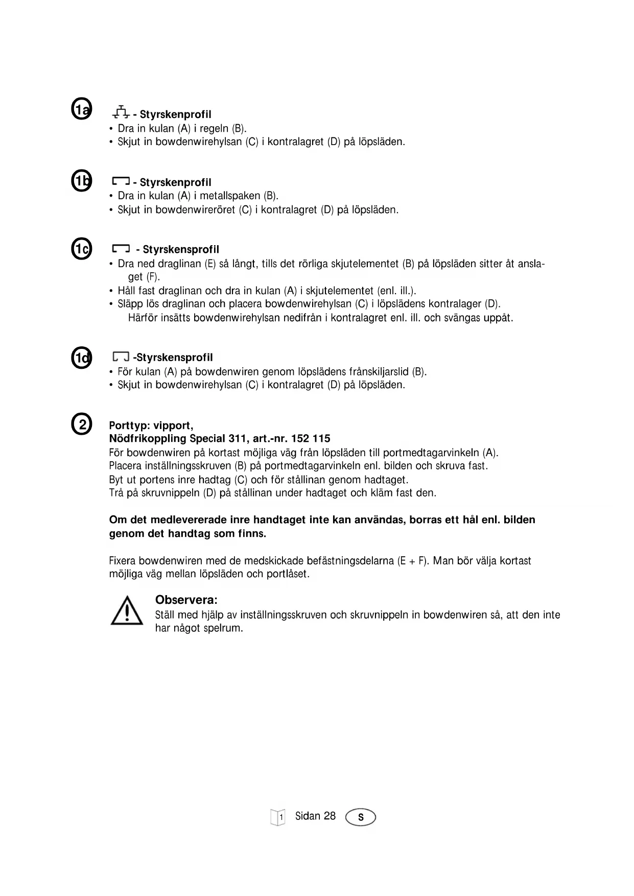 Porttyp: vipport, Nödfrikoppling Special 311, art.-nr. 152 115 För bowdenwiren på kortast möjliga väg från löpsläden till portmedtagarvinkeln (A). Placera inställningsskruven (B) på portmedtagarvinkeln enl. bilden och skruva fast. Byt ut portens inre hadtag (C) och för stållinan genom hadtaget. Trå på skruvnippeln (D) på stållinan under hadtaget och kläm fast den. Om det medlevererade inre handtaget inte kan användas, borras ett hål enl. bilden genom det handtag som finns. Fixera bowdenwiren med de medskickade befästningsdelarna (E + F). Man bör välja kortast möjliga väg mellan löpsläden och portlåset. Observera: Ställ med hjälp av inställningsskruven och skruvnippeln in bowdenwiren så, att den inte har något spelrum. - Styrskenprofil