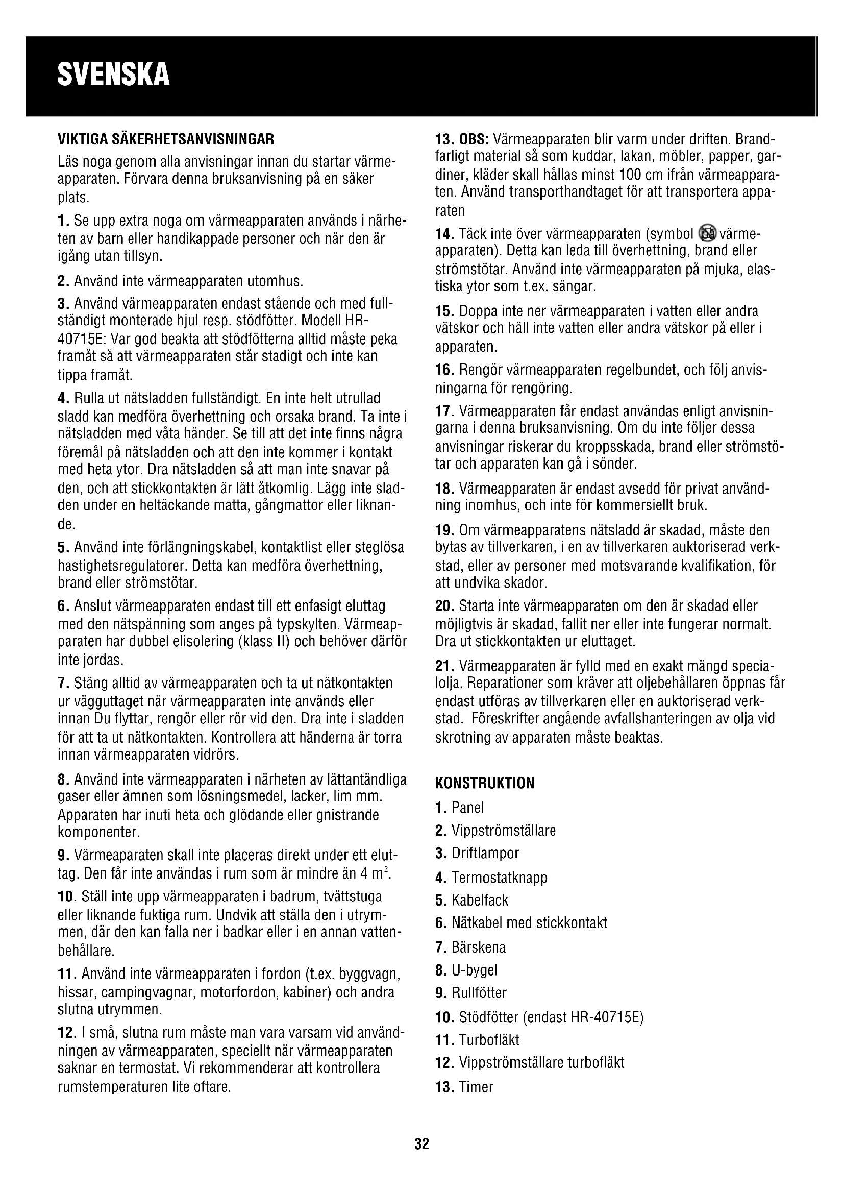 den stängas av med vippströmställaren (2) och termostat- knappen (2) vridas till lägsta positionen. Ta ut nätkontak- ten ur eluttaget och låt värmeapparaten svalna i minst 20 minuter. Använd alltid transporthandtagen när Du trans- porterar värmeapparaten (15). Timer (endast Modell HR-40920TE)