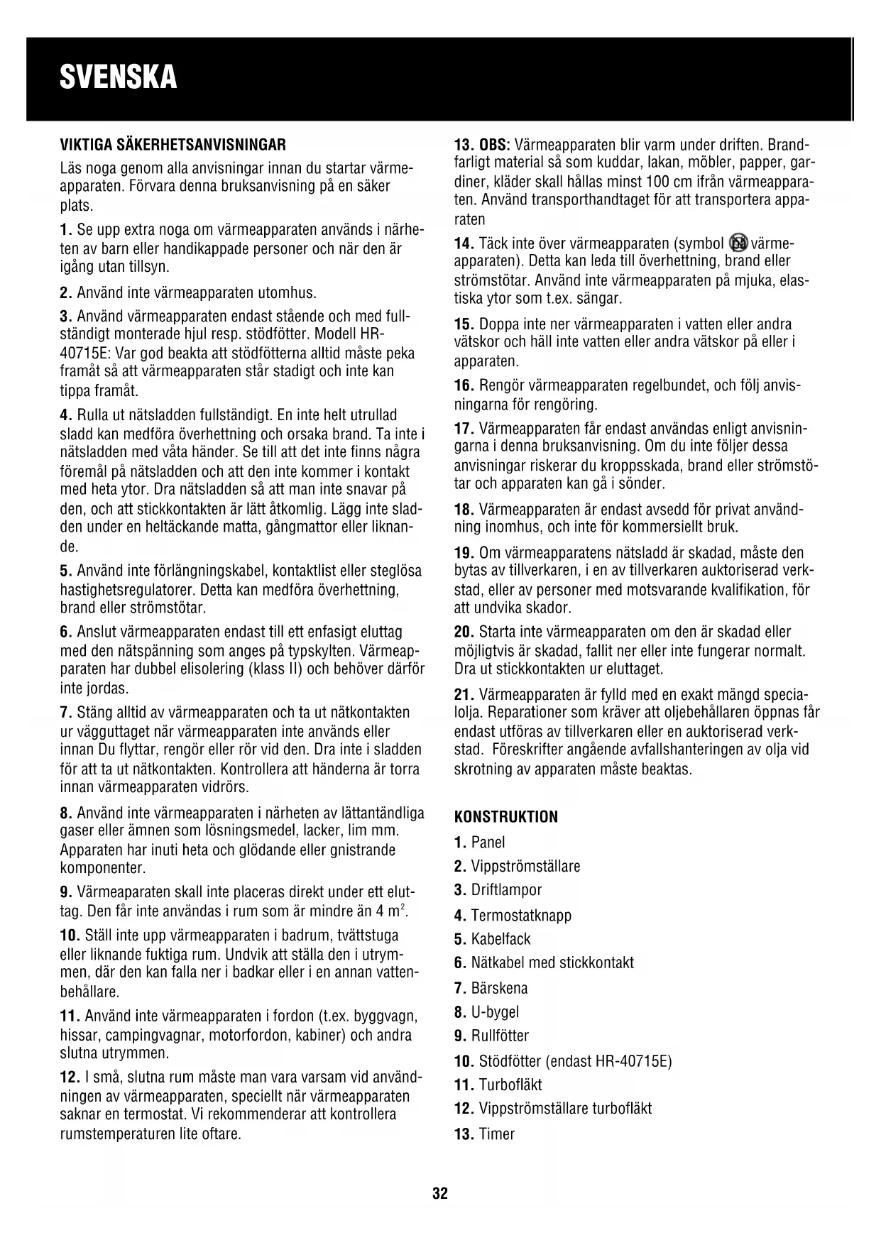 ständigt monterade hjul resp. stödfötter. Modell HR- 40715E: Var god beakta att stödfötterna alltid måste peka framåt så att värmeapparaten står stadigt och inte kan tippa framåt.