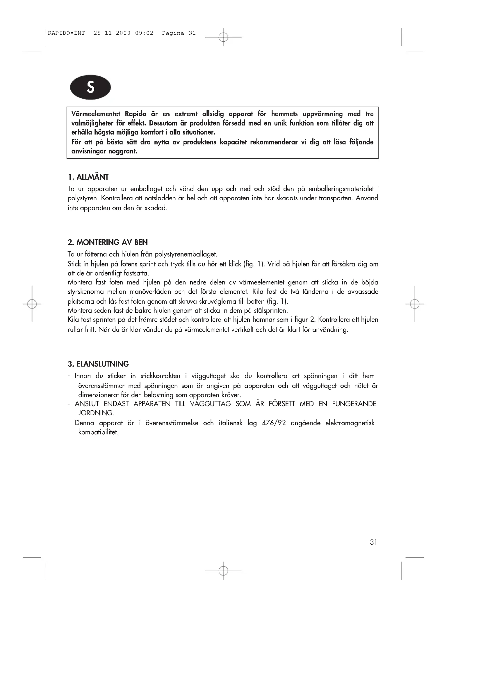 RAPIDO•INT 28-11-2000 09:02 Pagina 3031 Värmeelementet Rapido är en extremt allsidig apparat för hemmets uppvärmning med tre valmöjligheter för effekt. Dessutom är produkten försedd med en unik funktion som tillåter dig att erhålla högsta möjliga komfort i alla situationer. För att på bästa sätt dra nytta av produktens kapacitet rekommenderar vi dig att läsa följande anvisningar noggrant.