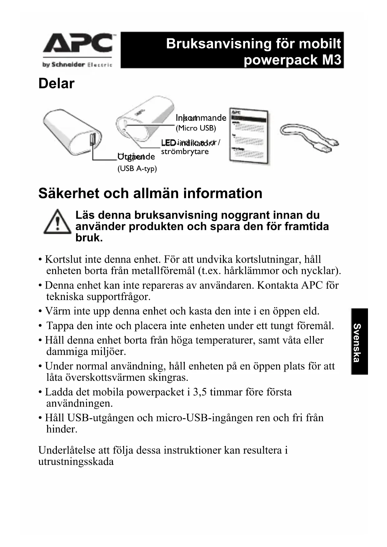F)© 2015 APC by Schneider Electric. APC och APC- logotypen och tillhör Schneider Electric Industries S.A.S. eller deras dotterbolag. Alla övriga varumärken tillhör sina respektive ägare. SV 990-5593 01/2015 Svenska Felsökning APC by Schneider Electric Global IT- kundsupport För landsspecifik kundsupport, gå till APC by Schneider Electrics webbplats: www.apc.com. Problem/möjlig orsak Lösning Det mobila powerpacket kan inte laddas USB-laddaren kanske inte fungerar eller datorn är i viloläget. Testa med en annan USB-laddare eller väck upp datorn från viloläget. Micro USB-kabeln och kontakterna har nötts ut. Testa en ny micro USB-kontakt. Det mobila powerpacket kan inte ladda vissa enheter. Det mobila powerpacket kan inte känna igen och detektera enheterna som är anslutna till den. Vissa USB-kablar i butiker kanske inte fungerar väl tillsammans med M3 batteripacket. För att lösa detta problem, tryck på strömbrytaren på M3 för att starta laddning av enheten. Om batteripacket fortfarande inte laddar enheten, byt ut kabeln du köpt i butik med originalkabeln som medföljer enheten. En överbelastning har inträffat och orange LED- indikator blinkar på M3. M3 laddar en enhet och dess USB- utgångsström överskrider angiven intervall. Ta bort enheten som laddas av M3 powerpacket. Livslängden för det mobila powerpacket har utgått eller ett fel har inträffat. Vid systemfel, kontakta din lokala återförsäljare av APC by Schneider Electric eller en auktoriserad serviceverkstad för APC by Schneider Electric.Русский Комплект поставки Общая информация и меры предосторожности Перед использованием данного устройства внимательно прочтите настоящее руководство и сохраните его для использования в дальнейшем.