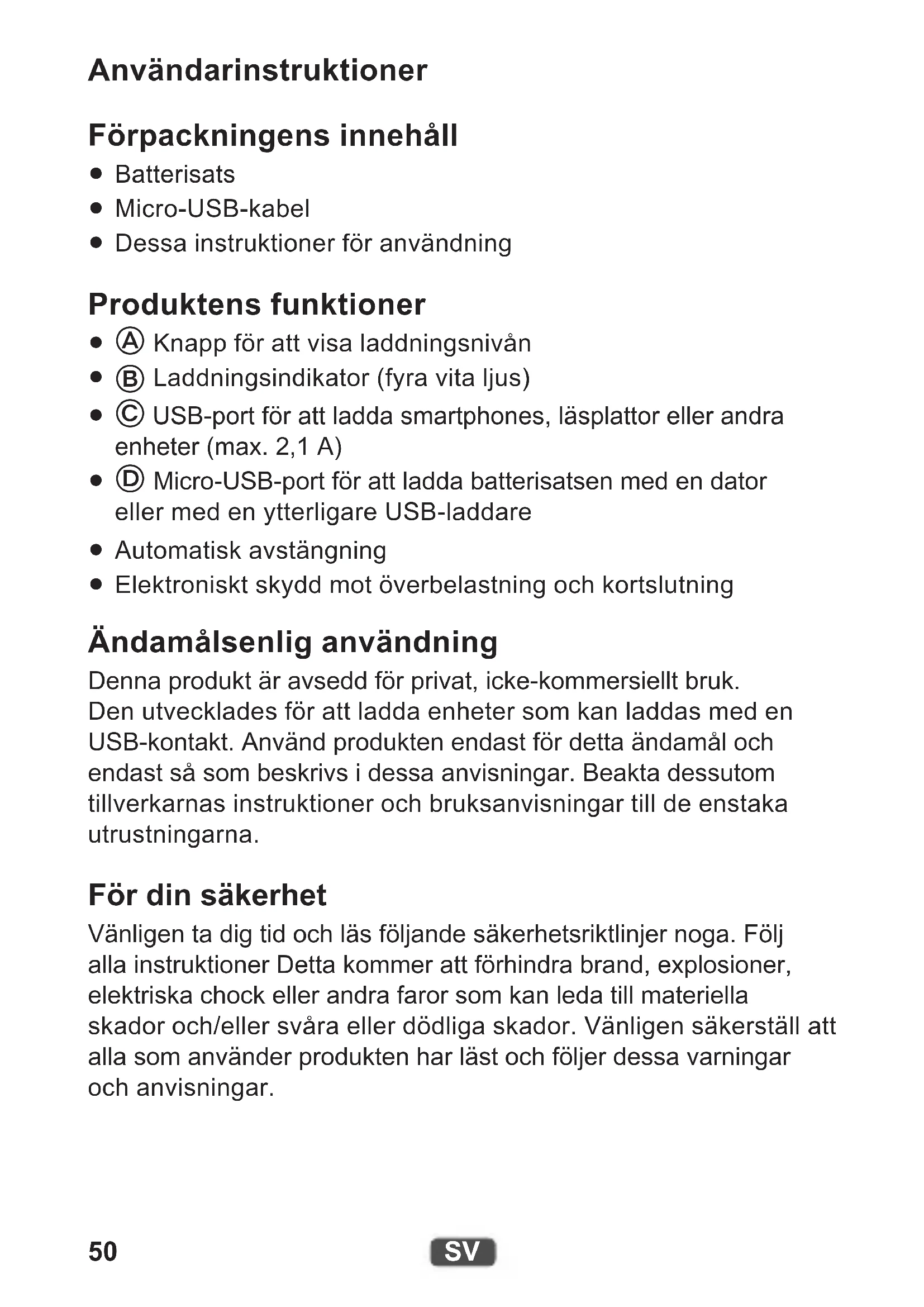 Elektroniskt skydd mot överbelastning och kortslutning Ändamålsenlig användning Denna produkt är avsedd för privat, icke-kommersiellt bruk. Den utvecklades för att ladda enheter som kan laddas med en USB-kontakt. Använd produkten endast för detta ändamål och endast så som beskrivs i dessa anvisningar. Beakta dessutom tillverkarnas instruktioner och bruksanvisningar till de enstaka utrustningarna. För din säkerhet Vänligen ta dig tid och läs följande säkerhetsriktlinjer noga. Följ alla instruktioner Detta kommer att förhindra brand, explosioner, elektriska chock eller andra faror som kan leda till materiella skador och/eller svåra eller dödliga skador. Vänligen säkerställ att alla som använder produkten har läst och följer dessa varningar och anvisningar.51