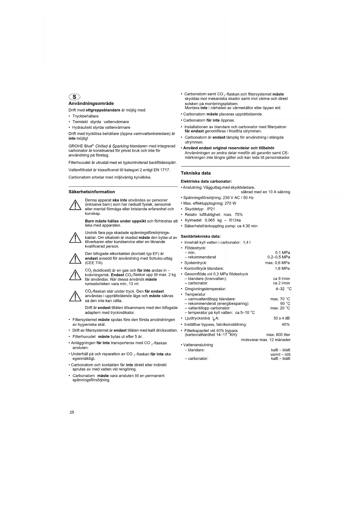 Chilled & Sparkling blandaren med integrerad carbonator är konstruerad för privat bruk och inte för användning på företag. Filterhuvudet är utrustat med en typkontrollerad backflödesspärr. Vattenfiltratet är klassificerat till kategori 2 enligt EN 1717. Carbonatorn arbetar med miljövänlig kylvätska. Säkerhetsinformation Denna apparat ska inte användas av personer (inklusive barn) som har nedsatt fysisk, sensorisk eller mental förmåga eller bristande erfarenhet och kunskap. Barn måste hållas under uppsikt och förhindras att leka med apparaten. Undvik fara pga skadade spänningsförsörjnings- kablar. Om elkabeln är skadad måste den bytas ut av tillverkaren eller kundservice eller en liknande kvalificerad person. Den bifogade elkontakten (kontakt typ EF) är endast avsedd för användning med Schuko-uttag (CEE 7/4).