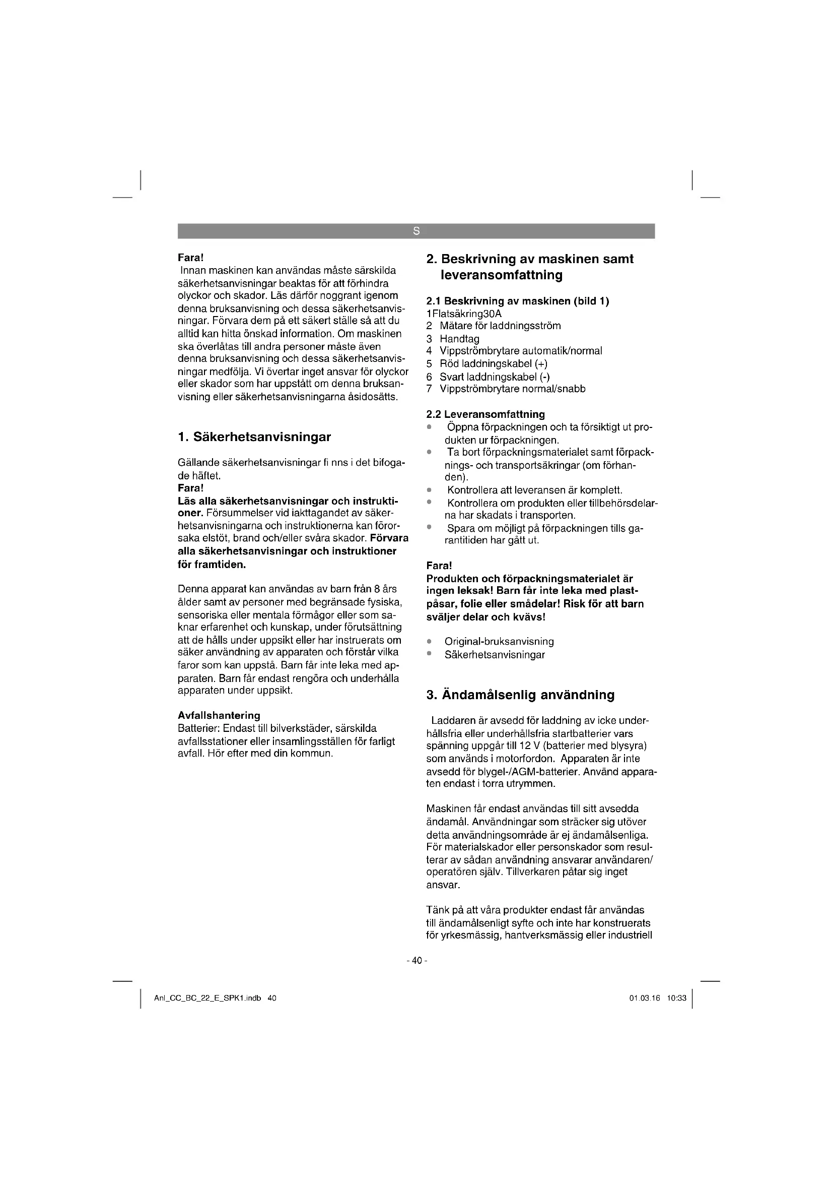 Laddaren är avsedd för laddning av icke under- hållsfria eller underhållsfria startbatterier vars spänning uppgår till 12 V (batterier med blysyra) som används i motorfordon. Apparaten är inte avsedd för blygel-/AGM-batterier. Använd appara- ten endast i torra utrymmen. Maskinen får endast användas till sitt avsedda ändamål. Användningar som sträcker sig utöver detta användningsområde är ej ändamålsenliga. För materialskador eller personskador som resul- terar av sådan användning ansvarar användaren/ operatören själv. Tillverkaren påtar sig inget ansvar. Tänk på att våra produkter endast får användas till ändamålsenligt syfte och inte har konstruerats för yrkesmässig, hantverksmässig eller industriell Anl_CC_BC_22_E_SPK1.indb 40Anl_CC_BC_22_E_SPK1.indb 40 01.03.16 10:3301.03.16 10:33S
