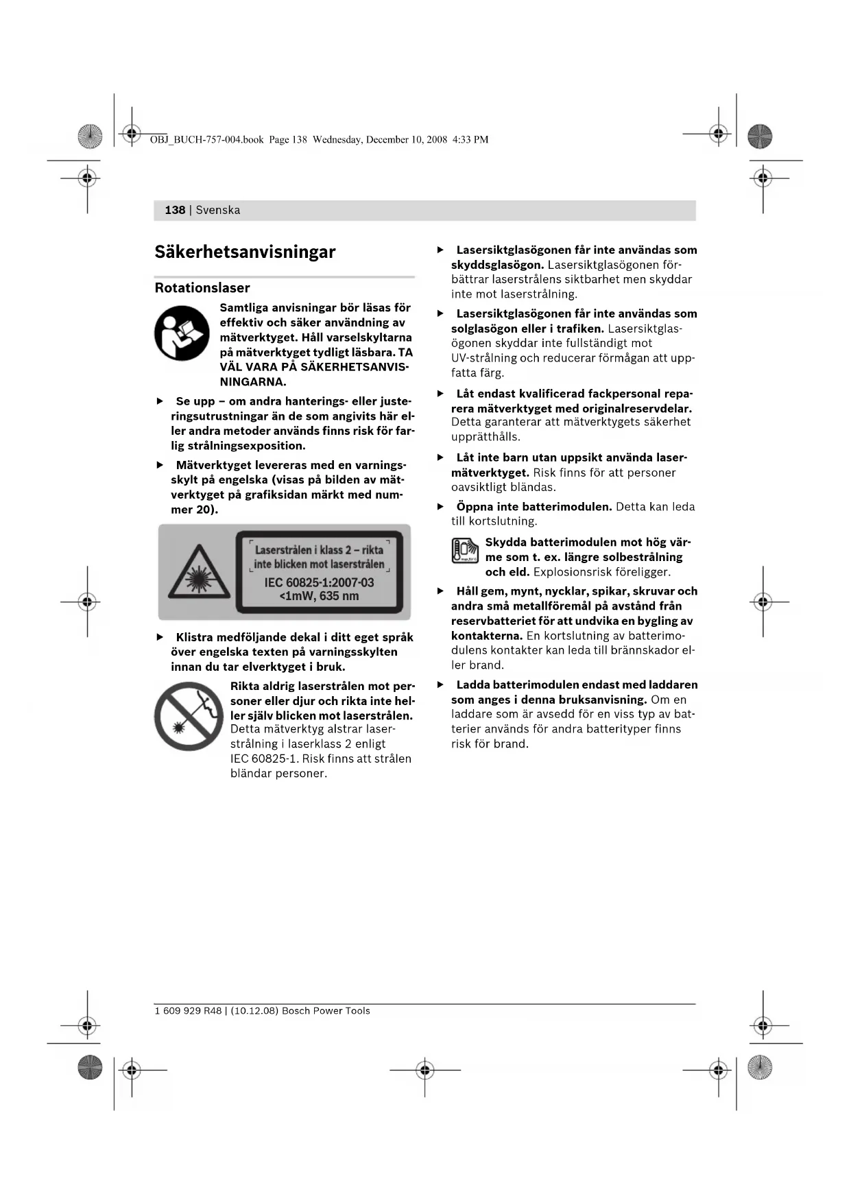 Säkerhetsanvisningar Rotationslaser Samtliga anvisningar bör läsas för effektiv och säker användning av mätverktyget. Håll varselskyltarna på mätverktyget tydligt läsbara. TA
