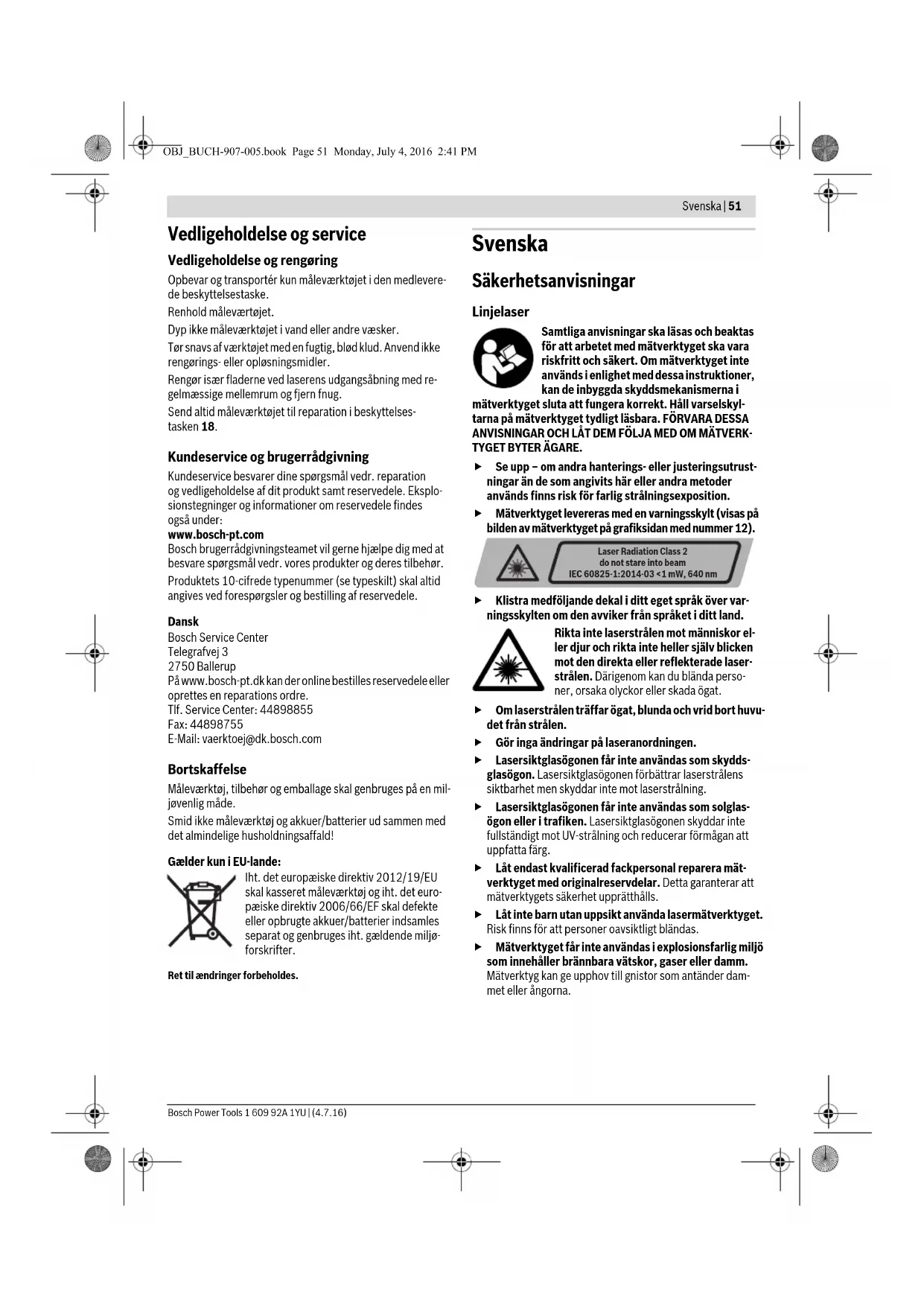 OBJ_BUCH-907-005.book Page 50 Monday, July 4, 2016 2:41 PMSvenska | 51 Bosch Power Tools 1 609 92A 1YU | (4.7.16) Vedligeholdelse og service Vedligeholdelse og rengøring Opbevar og transportér kun måleværktøjet i den medlevere- de beskyttelsestaske. Renhold måleværtøjet. Dyp ikke måleværktøjet i vand eller andre væsker. Tør snavs af værktøjet med en fugtig, blød klud. Anvend ikke rengørings- eller opløsningsmidler. Rengør især fladerne ved laserens udgangsåbning med re- gelmæssige mellemrum og fjern fnug. Send altid måleværktøjet til reparation i beskyttelses- tasken 18. Kundeservice og brugerrådgivning Kundeservice besvarer dine spørgsmål vedr. reparation og vedligeholdelse af dit produkt samt reservedele. Eksplo- sionstegninger og informationer om reservedele findes også under: www.bosch-pt.com Bosch brugerrådgivningsteamet vil gerne hjælpe dig med at besvare spørgsmål vedr. vores produkter og deres tilbehør. Produktets 10-cifrede typenummer (se typeskilt) skal altid angives ved forespørgsler og bestilling af reservedele. Dansk Bosch Service Center Telegrafvej 3 2750 Ballerup På www.bosch-pt.dk kan der online bestilles reservedele eller oprettes en reparations ordre. Tlf. Service Center: 44898855 Fax: 44898755 E-Mail: vaerktoej@dk.bosch.com Bortskaffelse Måleværktøj, tilbehør og emballage skal genbruges på en mil- jøvenlig måde. Smid ikke måleværktøj og akkuer/batterier ud sammen med det almindelige husholdningsaffald! Gælder kun i EU-lande: Iht. det europæiske direktiv 2012/19/EU skal kasseret måleværktøj og iht. det euro- pæiske direktiv 2006/66/EF skal defekte eller opbrugte akkuer/batterier indsamles separat og genbruges iht. gældende miljø- forskrifter. Ret til ændringer forbeholdes. Svenska Säkerhetsanvisningar Linjelaser Samtliga anvisningar ska läsas och beaktas för att arbetet med mätverktyget ska vara riskfritt och säkert. Om mätverktyget inte används i enlighet med dessa instruktioner, kan de inbyggda skyddsmekanismerna i mätverktyget sluta att fungera korrekt. Håll varselskyl- tarna på mätverktyget tydligt läsbara. FÖRVARA DESSA ANVISNINGAR OCH LÅT DEM FÖLJA MED OM MÄTVERK- TYGET BYTER ÄGARE. Se upp – om andra hanterings- eller justeringsutrust- ningar än de som angivits här eller andra metoder används finns risk för farlig strålningsexposition. Mätverktyget levereras med en varningsskylt (visas på bilden av mätverktyget på grafiksidan med nummer 12). Klistra medföljande dekal i ditt eget språk över var- ningsskylten om den avviker från språket i ditt land. Rikta inte laserstrålen mot människor el- ler djur och rikta inte heller själv blicken mot den direkta eller reflekterade laser- strålen. Därigenom kan du blända perso- ner, orsaka olyckor eller skada ögat. Om laserstrålen träffar ögat, blunda och vrid bort huvu- det från strålen. Gör inga ändringar på laseranordningen. Lasersiktglasögonen får inte användas som skydds- glasögon. Lasersiktglasögonen förbättrar laserstrålens siktbarhet men skyddar inte mot laserstrålning. Lasersiktglasögonen får inte användas som solglas- ögon eller i trafiken. Lasersiktglasögonen skyddar inte fullständigt mot UV-strålning och reducerar förmågan att uppfatta färg. Låt endast kvalificerad fackpersonal reparera mät- verktyget med originalreservdelar. Detta garanterar att mätverktygets säkerhet upprätthålls. Låt inte barn utan uppsikt använda lasermätverktyget. Risk finns för att personer oavsiktligt bländas. Mätverktyget får inte användas i explosionsfarlig miljö som innehåller brännbara vätskor, gaser eller damm. Mätverktyg kan ge upphov till gnistor som antänder dam- met eller ångorna. Laser Radiation Class 2do not stare into beamIEC 60825-1:2014-03 <1 mW, 640 nm OBJ_BUCH-907-005.book Page 51 Monday, July 4, 2016 2:41 PM52 | Svenska 1 609 92A 1YU | (4.7.16) Bosch Power Tools Lasermåltavla Håll inte mätverktyget och inte heller laser- måltavlan 15 nära an pacemaker. Risk finns att magneterna i mätverktyget och lasermål- tavlan alstrar ett fält som menligt kan påverka pacemakerns funktion. Håll mätverktyget och lasermåltavlan 15 på betryg- gande avstånd från magnetiska datamedia och magne- tiskt känsliga apparater. Magneterna i mätverktyget och lasermåltavlan kan leda till irreversibla dataförluster. Produkt- och kapacitetsbeskrivning Fäll upp sidan med illustration av mätverktyget och håll sidan uppfälld när du läser bruksanvisningen. Ändamålsenlig användning Mätverktyget är avsett för bestämning och kontroll av vågräta och lodräta linjer. Bullerinformation Signalens A-vägda ljudtrycksnivå är 80 dB(A) på en meters avstånd. Håll inte mätverktyget nära öronen! Illustrerade komponenter Numreringen av komponenterna hänvisar till illustration av mätverktyget på grafiksidan. 1 Utloppsöppning för laserstrålning 2 Batterivarning 3 Knapp för pulsfunktion 4 Indikering av pulsfunktion 5 Funktionsknapp 6 Indikering utan nivelleringsautomatik 7 Strömställare Till/Från 8 Stativfäste 5/8" 9 Stativfäste 1/4" 10 Batterifackets lock 11 Spärr på batterifackets lock 12 Laservarningsskylt 13 Serienummer 14 Magneter 15 Lasermåltavla 16 Mätplatta med fot* 17 Lasermottagare* 18 Skyddsfodral* 19 Universalfäste* 20 Teleskopstång* 21 Lasersiktglasögon* 22 Stativ*