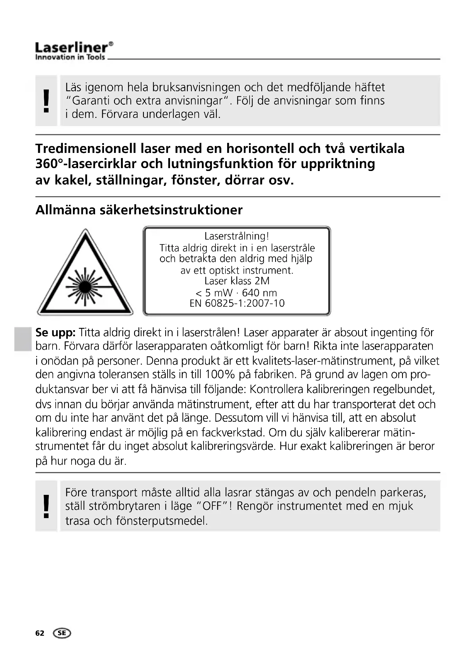Allmänna säkerhetsinstruktioner Se upp: Titta aldrig direkt in i laserstrålen! Laser apparater är absout ingenting för barn. Förvara därför laserapparaten oåtkomligt för barn! Rikta inte laserapparaten i onödan på personer. Denna produkt är ett kvalitets-laser-mätinstrument, på vilket den angivna toleransen ställs in till 100% på fabriken. På grund av lagen om pro- duktansvar ber vi att få hänvisa till följande: Kontrollera kalibreringen regelbundet, dvs innan du börjar använda mätinstrument, efter att du har transporterat det och om du inte har använt det på länge. Dessutom vill vi hänvisa till, att en absolut kalibrering endast är möjlig på en fackverkstad. Om du själv kalibererar mätin- strumentet får du inget absolut kalibreringsvärde. Hur exakt kalibreringen är beror på hur noga du är. Laserstrålning! Titta aldrig direkt in i en laserstråle och betrakta den aldrig med hjälp av ett optiskt instrument. Laser klass 2M < 5 mW · 640 nm EN 60825-1:2007-10 Före transport måste alltid alla lasrar stängas av och pendeln parkeras, ställ strömbrytaren i läge ”OFF”! Rengör instrumentet med en mjuk trasa och fönsterputsmedel.