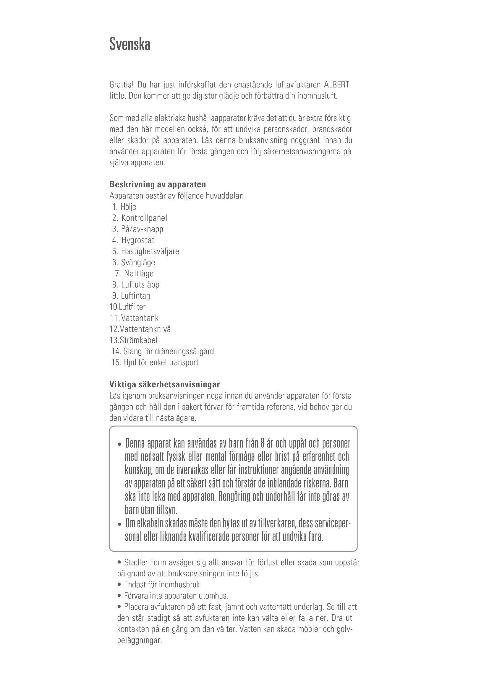 Dimensjoner 298 x 555 x 216 mm (bredde x høyde x dybde) Omtrentlig vekt 10.5 kg Tankkapasitet 2.0 L Maks. avfukting per dag 10 L Lydnivå 32 – 43 dB (A) Kjølemiddel: R134a (120 g) I samsvar med EU-forskrifter CE / WEEE / RoHS / EAC Alle rettigheter ovenfor tekniske modifikasjoner er forbeholdtGrattis! Du har just införskaffat den enastående luftavfuktaren ALBERT little. Den kommer att ge dig stor glädje och förbättra din inomhusluft. Som med alla elektriska hushållsapparater krävs det att du är extra försiktig med den här modellen också, för att undvika personskador, brandskador eller skador på apparaten. Läs denna bruksanvisning noggrant innan du använder apparaten för första gången och följ säkerhetsanvisningarna på själva apparaten. Beskrivning av apparaten Apparaten består av följande huvuddelar: