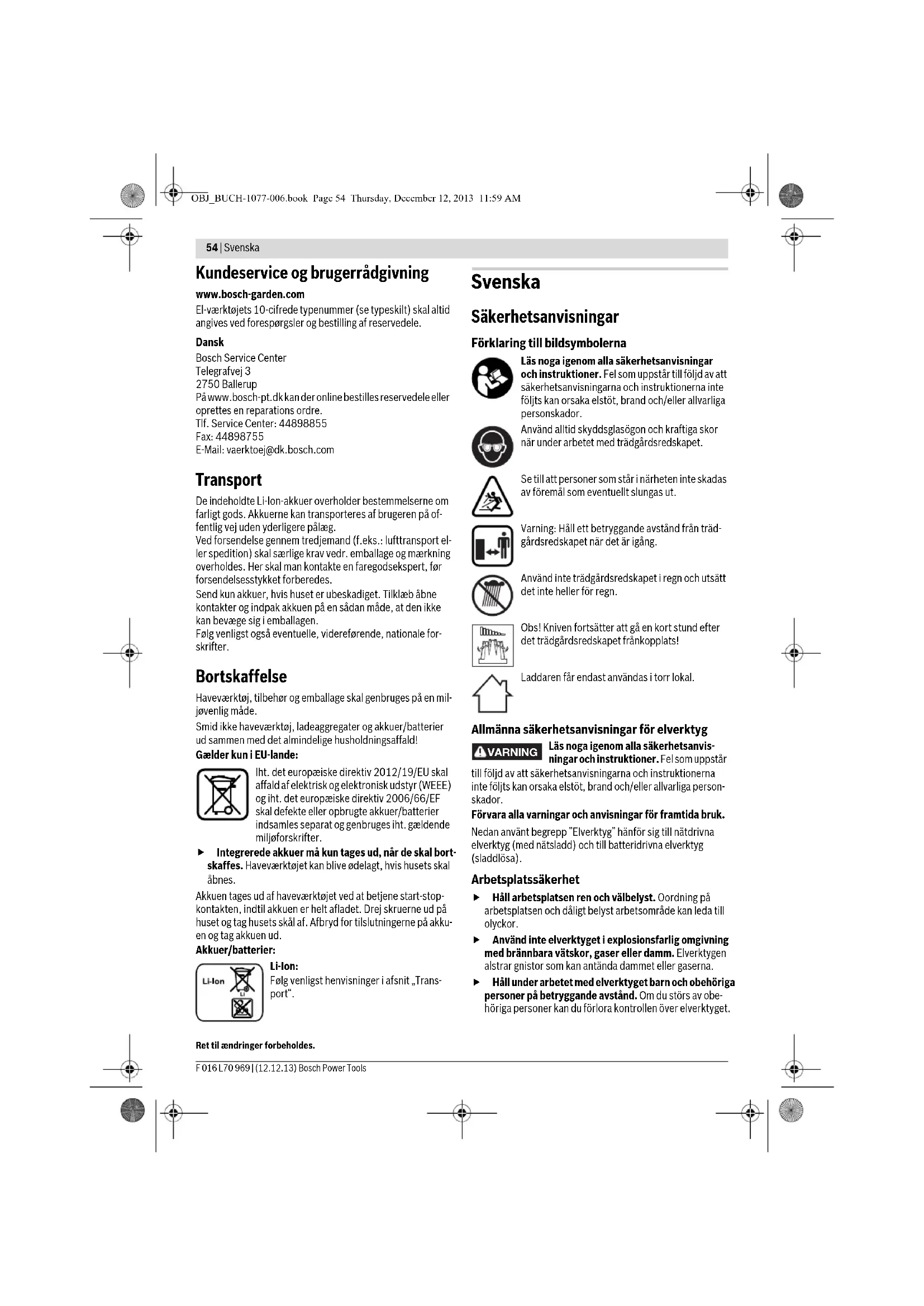 Montering og drift Anti-blokerings-mekanisme Haveværktøjet råder over en patenteret egenskab, der funge- rer på følgende måde: Blokerer skærekniven i modstandsdygtigt materiale, øges motorens belastning. Den intelligente mikroelektronik identi- ficerer denne overbelastningssituation og gentager flere gan- ge motorskiftet for således at forhindre en blokering af skære- knivene og gennemskære materialet. Dette hørbare skift varer op til 3 s. Efter gennemskæringen arbejder haveværktøjet videre i nor- mal tilstand, eller skærekniven bliver automatisk stående i åb- net tilstand, hvis den overbelastede situation forbliver uæn- dret (f.eks. hvis et stykke metalhegn tilfældigt blokerer haveværktøjet). Akku-ladetilstandsindikator Akku-ladetilstandsindikatoren viser ladefremskridtet. Under opladningen blinker lampen grøn. Lyser akku-ladetilstands- indikatoren grøn hele tiden, er akkuen helt opladet. Akku-ladetilstandsindikatoren viser – når start-stop-kontak- ten er trykket halvt eller helt ned – akkuens ladetilstand i nog- le sekunder. Fejlsøgning Vedligeholdelse og rengøring Pas på! Sluk haveværktøjet, før vedligeholdelses- eller rengøringsarbejde gennemføres. Når haveværktøjet er blevet slukket, bevæger knivene sig i endnu et par sekunder. Vær forsigtig! Berør ikke knive, der bevæger sig. Hold haveværktøjet rent for at arbejde sikkert og godt. Brug altid beskyttelseshandsker, når du arbejder med haveværktøjet eller gennemfører vedligeholdelses-/ rengøringsarbejde. Undersøg haveværktøjet for synlige mangler med regelmæs- sige mellemrum som f.eks. løse fastgørelser og slidte eller be- skadigede dele. Henk Becker Executive Vice President Engineering Helmut Heinzelmann Head of Product Certification PT/ETM9 Handlingsmål Fig. Leveringsomfang 1 Opladning af akku 2 Demontering 3 Montering 4 Tænd/sluk 5 Teleskopskaft med hjul monteres 6 Greblængde indstilles 7 Stilling til kantskæring 8 Vedligeholdelse 9 Tilbehør 10 LED Kapacitet Konstant lys grøn 35 – 100% Blinklys grøn 15 – 35% Blinklys rød 5 – 15% Konstant lys rød 0 – 5% Symptom Mulig årsag Afhjælpning For lille snitvarighed pr. akku-opladning Akkuen er ved at være brugt op Kontakt serviceforhandleren Akku-kontrollampe lyser hele tiden Opladning er ikke mulig Akku defekt Kontakt serviceforhandleren OBJ_BUCH-1077-006.book Page 53 Thursday, December 12, 2013 11:59 AM54 | Svenska F 016 L70 969 | (12.12.13) Bosch Power Tools Kundeservice og brugerrådgivning www.bosch-garden.com El-værktøjets 10-cifrede typenummer (se typeskilt) skal altid angives ved forespørgsler og bestilling af reservedele. Dansk Bosch Service Center Telegrafvej 3 2750 Ballerup På www.bosch-pt.dk kan der online bestilles reservedele eller oprettes en reparations ordre. Tlf. Service Center: 44898855 Fax: 44898755 E-Mail: vaerktoej@dk.bosch.com Transport De indeholdte Li-Ion-akkuer overholder bestemmelserne om farligt gods. Akkuerne kan transporteres af brugeren på of- fentlig vej uden yderligere pålæg. Ved forsendelse gennem tredjemand (f.eks.: lufttransport el- ler spedition) skal særlige krav vedr. emballage og mærkning overholdes. Her skal man kontakte en faregodsekspert, før forsendelsesstykket forberedes. Send kun akkuer, hvis huset er ubeskadiget. Tilklæb åbne kontakter og indpak akkuen på en sådan måde, at den ikke kan bevæge sig i emballagen. Følg venligst også eventuelle, videreførende, nationale for- skrifter. Bortskaffelse Haveværktøj, tilbehør og emballage skal genbruges på en mil- jøvenlig måde. Smid ikke haveværktøj, ladeaggregater og akkuer/batterier ud sammen med det almindelige husholdningsaffald! Gælder kun i EU-lande: Iht. det europæiske direktiv 2012/19/EU skal affald af elektrisk og elektronisk udstyr (WEEE) og iht. det europæiske direktiv 2006/66/EF skal defekte eller opbrugte akkuer/batterier indsamles separat og genbruges iht. gældende miljøforskrifter. Integrerede akkuer må kun tages ud, når de skal bort- skaffes. Haveværktøjet kan blive ødelagt, hvis husets skal åbnes. Akkuen tages ud af haveværktøjet ved at betjene start-stop- kontakten, indtil akkuen er helt afladet. Drej skruerne ud på huset og tag husets skål af. Afbryd for tilslutningerne på akku- en og tag akkuen ud. Akkuer/batterier: Li-Ion: Følg venligst henvisninger i afsnit „Trans- port“. Ret til ændringer forbeholdes. Svenska Säkerhetsanvisningar Förklaring till bildsymbolerna Läs noga igenom alla säkerhetsanvisningar och instruktioner. Fel som uppstår till följd av att säkerhetsanvisningarna och instruktionerna inte följts kan orsaka elstöt, brand och/eller allvarliga personskador. Använd alltid skyddsglasögon och kraftiga skor när under arbetet med trädgårdsredskapet. Se till att personer som står i närheten inte skadas av föremål som eventuellt slungas ut. Varning: Håll ett betryggande avstånd från träd- gårdsredskapet när det är igång. Använd inte trädgårdsredskapet i regn och utsätt det inte heller för regn. Obs! Kniven fortsätter att gå en kort stund efter det trädgårdsredskapet frånkopplats! Laddaren får endast användas i torr lokal. Allmänna säkerhetsanvisningar för elverktyg Läs noga igenom alla säkerhetsanvis- ningar och instruktioner. Fel som uppstår till följd av att säkerhetsanvisningarna och instruktionerna inte följts kan orsaka elstöt, brand och/eller allvarliga person- skador. Förvara alla varningar och anvisningar för framtida bruk. Nedan använt begrepp ”Elverktyg” hänför sig till nätdrivna elverktyg (med nätsladd) och till batteridrivna elverktyg (sladdlösa). Arbetsplatssäkerhet Håll arbetsplatsen ren och välbelyst. Oordning på arbetsplatsen och dåligt belyst arbetsområde kan leda till olyckor. Använd inte elverktyget i explosionsfarlig omgivning med brännbara vätskor, gaser eller damm. Elverktygen alstrar gnistor som kan antända dammet eller gaserna. Håll under arbetet med elverktyget 