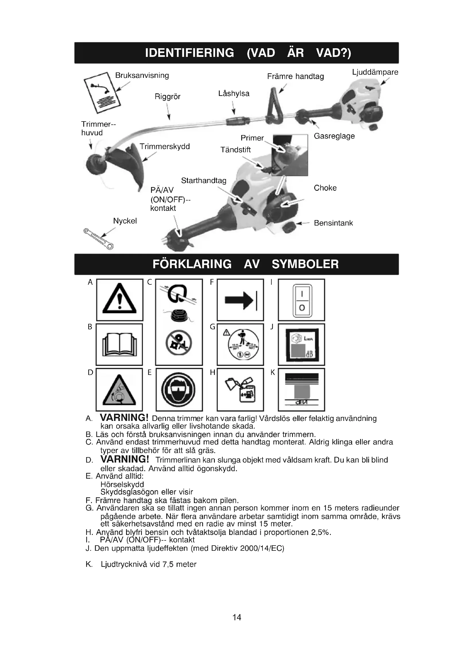 VARNING! Trimmerlinan kan slunga objekt med våldsam kraft. Du kan bli blind eller skadad. Använd alltid ögonskydd. E. Använd alltid: Hörselskydd Skyddsglasögon eller visir F. Främre handtag ska fästas bakom pilen. G. Användaren ska se tillatt ingen annan person kommer inom en 15 meters radieunder pågående arbete. När flera användare arbetar samtidigt inom samma område, krävs ett säkerhetsavstånd med en radie av minst 15 meter. H. Använd blyfri bensin och tvåtaktsolja blandad i proportionen 2,5%.