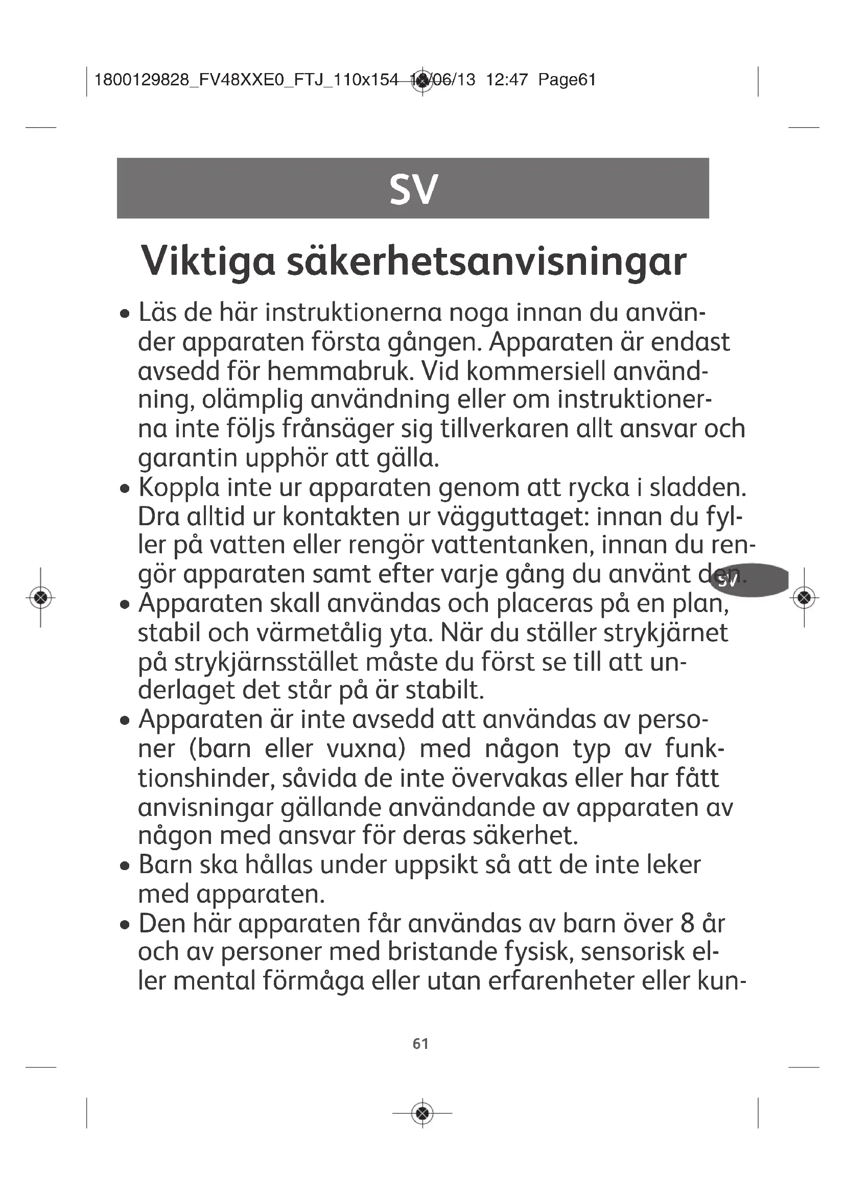 - Den här apparaten får användas av barn över 8 år och av personer med bristande fysisk, sensorisk el- ler mental förmåga eller utan erfarenheter eller kun- 1800129828_FV48XXE0_FTJ_110x154 18/06/13 12:47 Page6162 skaper, om de övervakas eller om de fått tydliga in- struktioner om apparaten och medföljande risker. Barn får inte leka med apparaten. Rengöring och un- derhåll av apparaten får inte utföras av barn om de inte är över 8 år samt övervakas. Förvara apparat och nätsladd utom räckhåll för barn under 8 år.