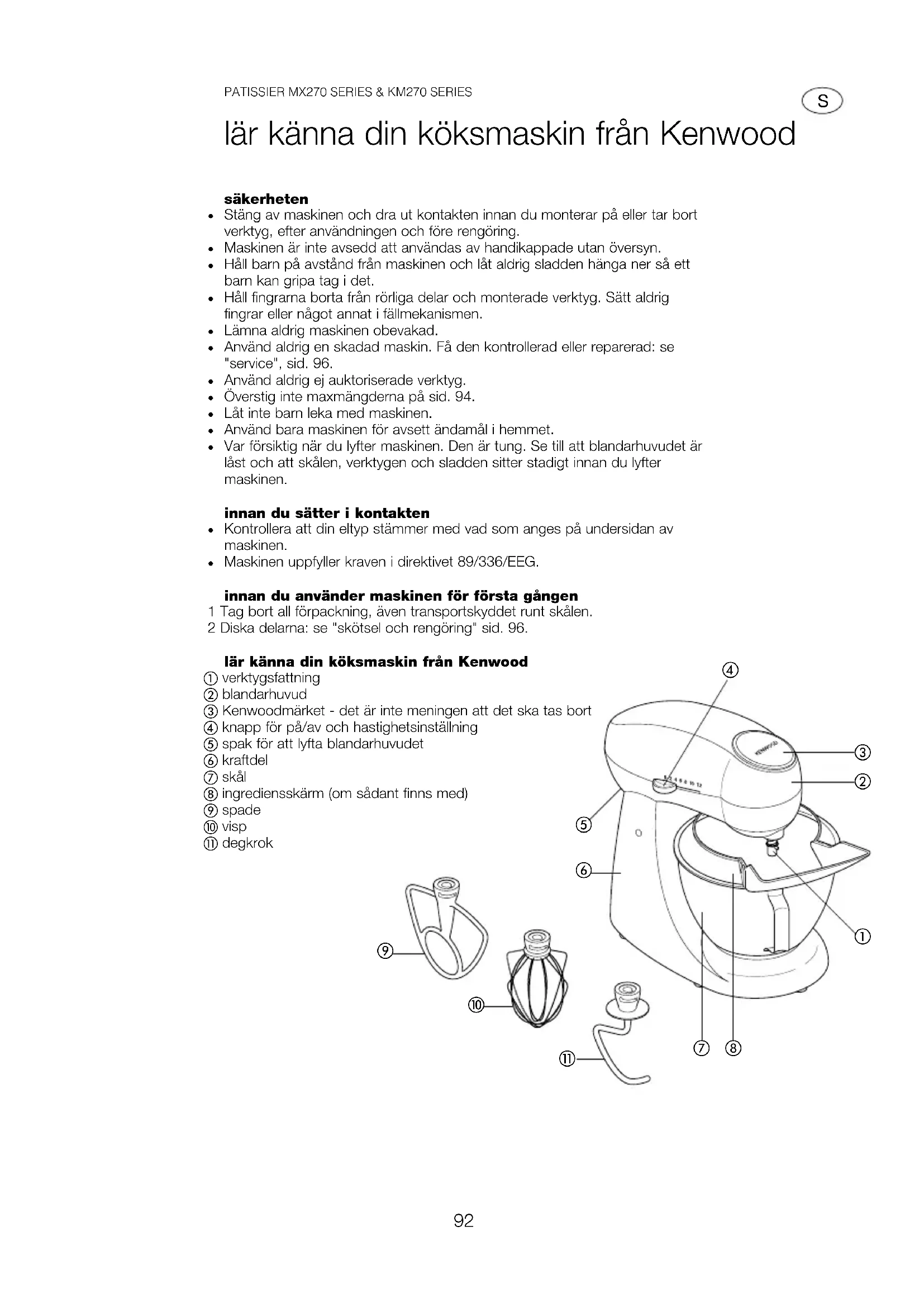 Maskinen uppfyller kraven i direktivet 89/336/EEG. innan du använder maskinen för första gången 1 Tag bort all förpackning, även transportskyddet runt skålen. 2 Diska delarna: se "skötsel och rengöring" sid. 96. lär känna din köksmaskin från Kenwood verktygsfattning blandarhuvud Kenwoodmärket - det är inte meningen att det ska tas bort knapp för på/av och hastighetsinställning spak för att lyfta blandarhuvudet kraftdel skål ingrediensskärm (om sådant finns med) spade visp degkrok