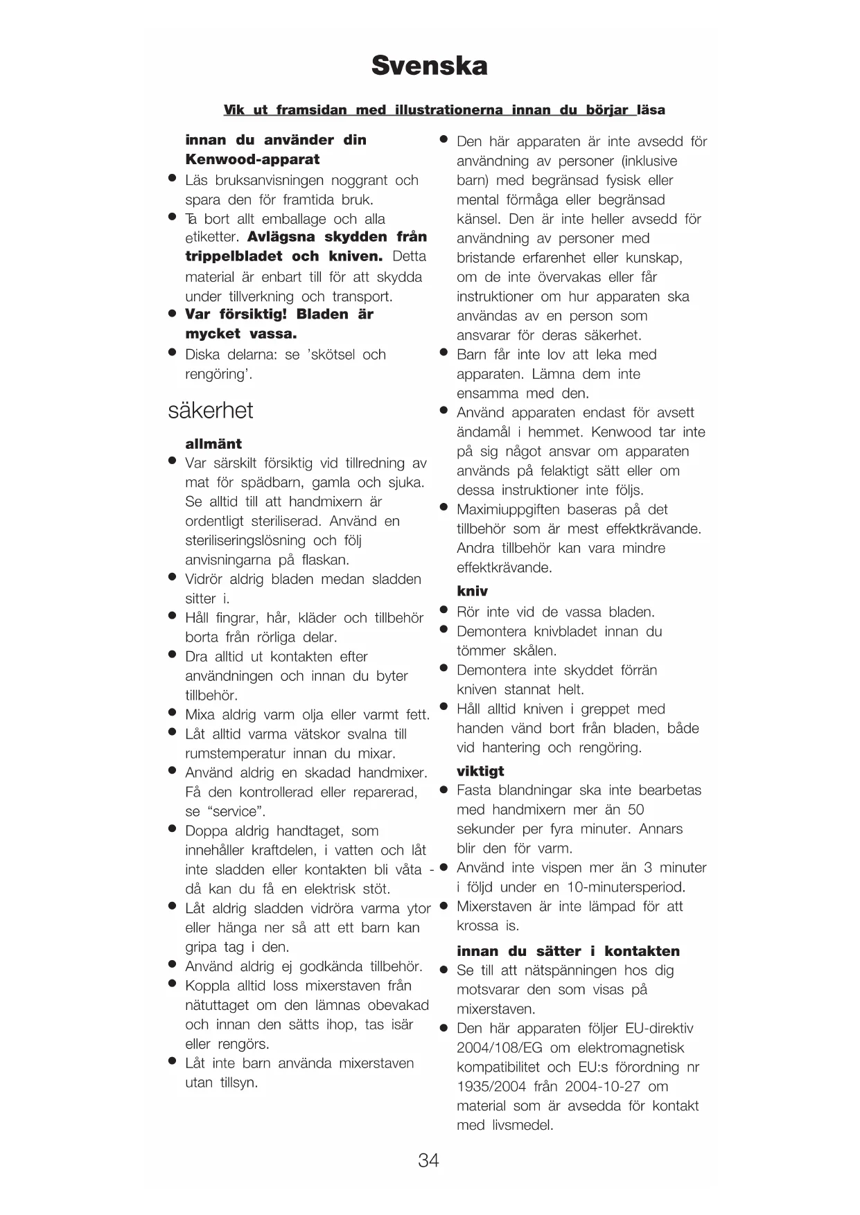 DIREKTIV 2002/96/EG. När produktens livslängd är över får den inte slängas i hushållssoporna. Den kan överlämnas till lokala myndigheters avfallssorteringscentraler eller till en återförsäljare som ger denna service. När du avfallshanterar en hushållsmaskin på rätt sätt undviker du de negativa konsekvenser för miljön och hälsan som kan uppkomma vid felaktig avfallshantering. Du möjliggör även återvinning av materialen vilket innebär en betydande besparing av energi och tillgångar. 37f ør du tar Kenwood-apparatet i bruk
