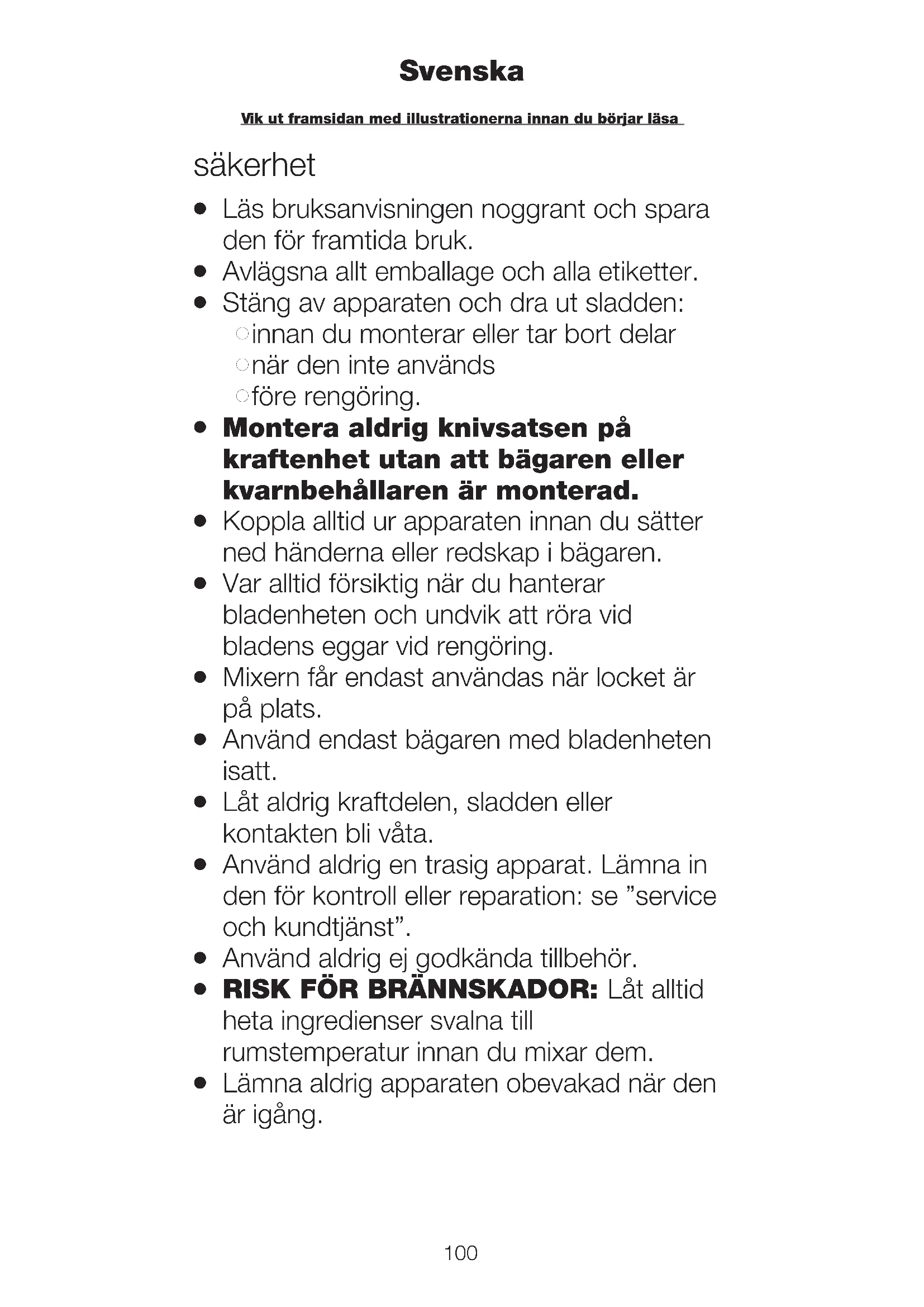 ik ut framsidan med illustrationerna innan du börjar läsa SvenskaG När du tar bort mixern eller kvarnen från strömdelen: