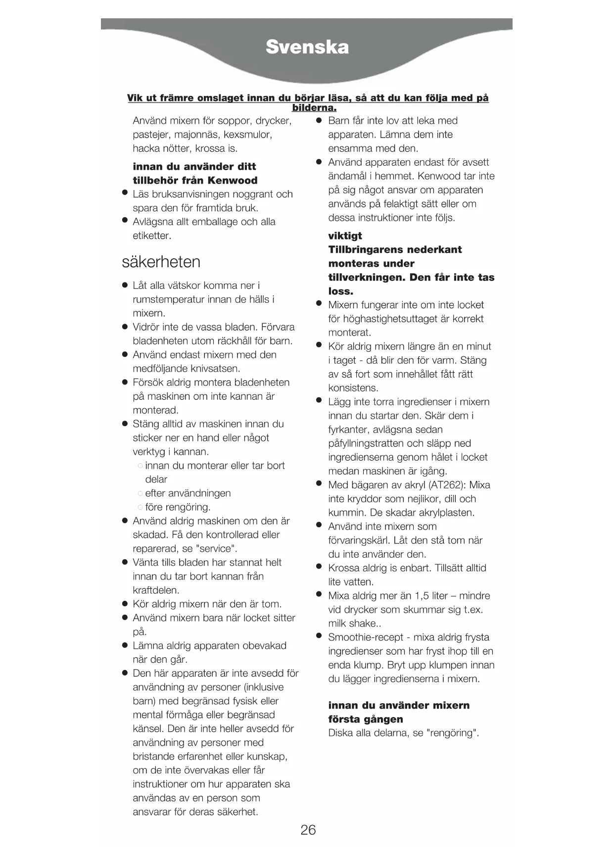 DIREKTIV 2002/96/EG. När produktens livslängd är över får den inte slängas i hushållssoporna. Den kan överlämnas till lokala myndigheters avfallssorteringscentraler eller till en återförsäljare som ger denna service. När du avfallshanterar en hushållsmaskin på rätt sätt undviker du de negativa konsekvenser för miljön och hälsan som kan uppkomma vid felaktig avfallshantering. Du möjliggör även återvinning av materialen vilket innebär en betydande besparing av energi och tillgångar. 28Bruk hurtigmikseren til supper, drikker, paté (postei), majones, brødsmuler, kjeks-smuler, hakking av nøtter, og knusing av is. før du bruker Kenwood- tilbehøret