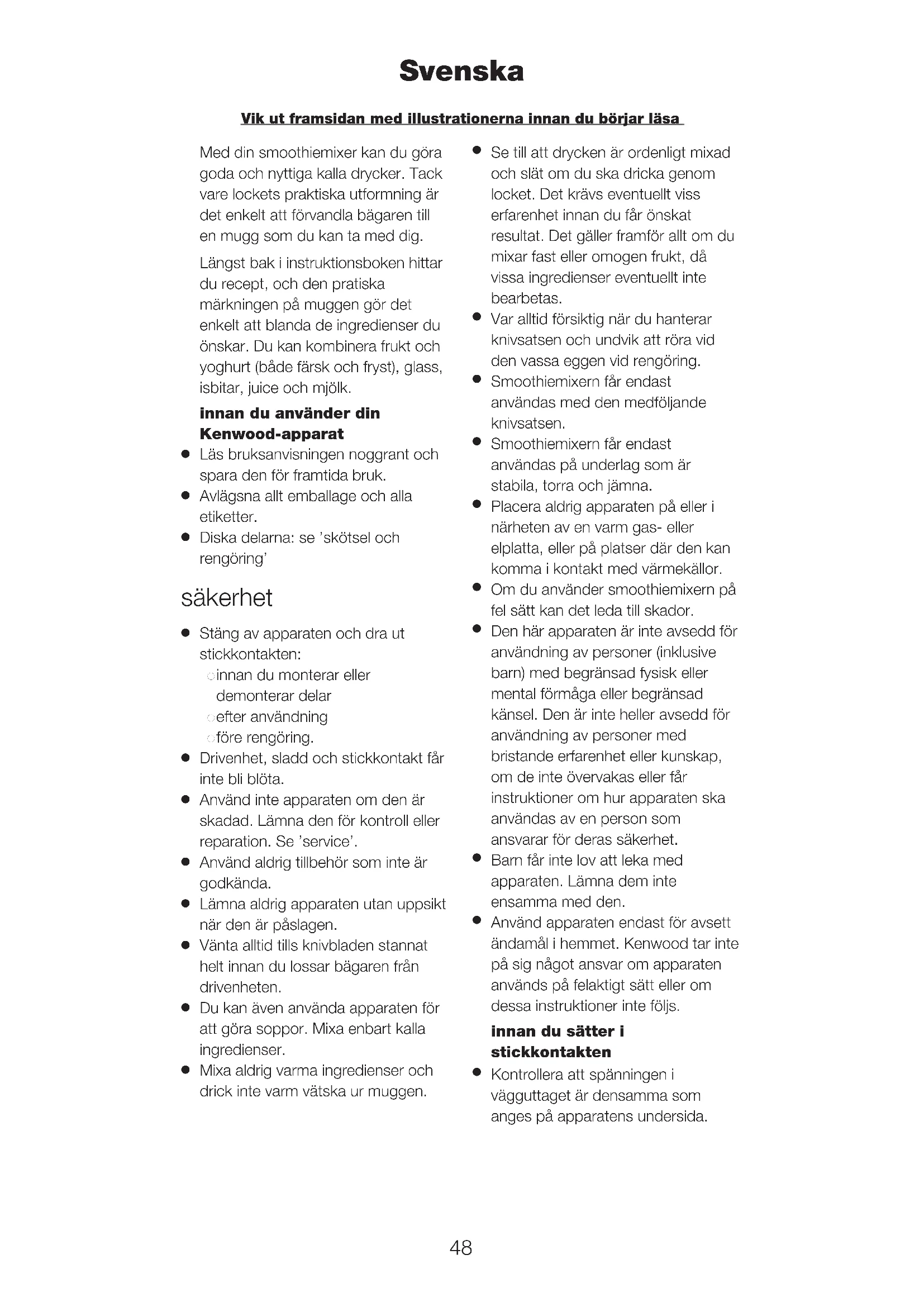 Använd apparaten endast för avsett ändamål i hemmet. Kenwood tar inte på sig något ansvar om apparaten används på felaktigt sätt eller om dessa instruktioner inte följs. innan du sätter i stickkontakten
