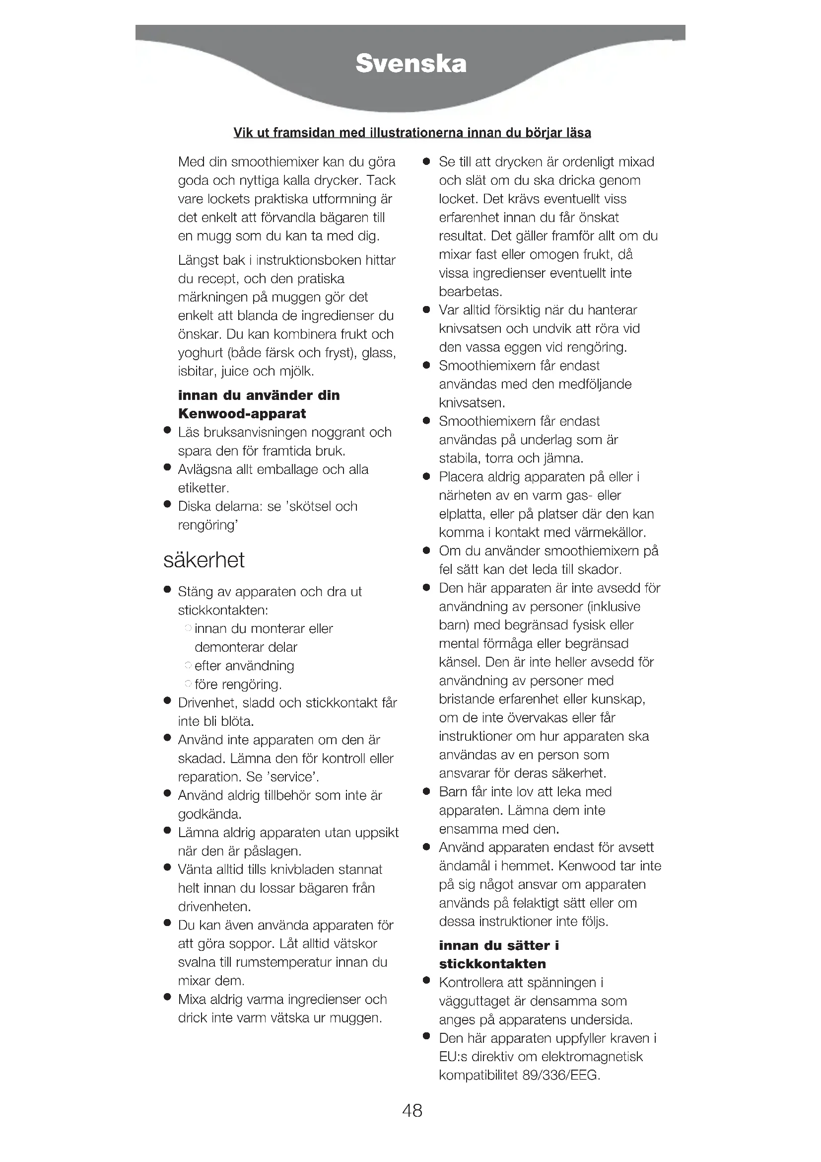 Använd apparaten endast för avsett ändamål i hemmet. Kenwood tar inte på sig något ansvar om apparaten används på felaktigt sätt eller om dessa instruktioner inte följs. innan du sätter i stickkontakten
