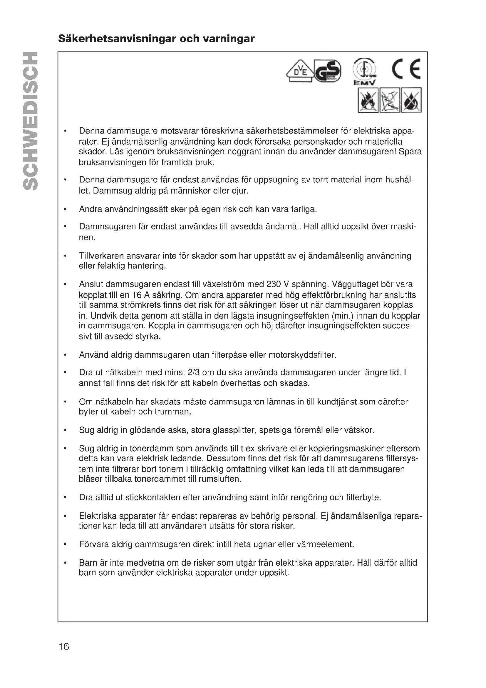 - Denna dammsugare motsvarar föreskrivna säkerhetsbestämmelser för elektriska appa- rater. Ej ändamålsenlig användning kan dock förorsaka personskador och materiella skador. Läs igenom bruksanvisningen noggrant innan du använder dammsugaren! Spara bruksanvisningen för framtida bruk.