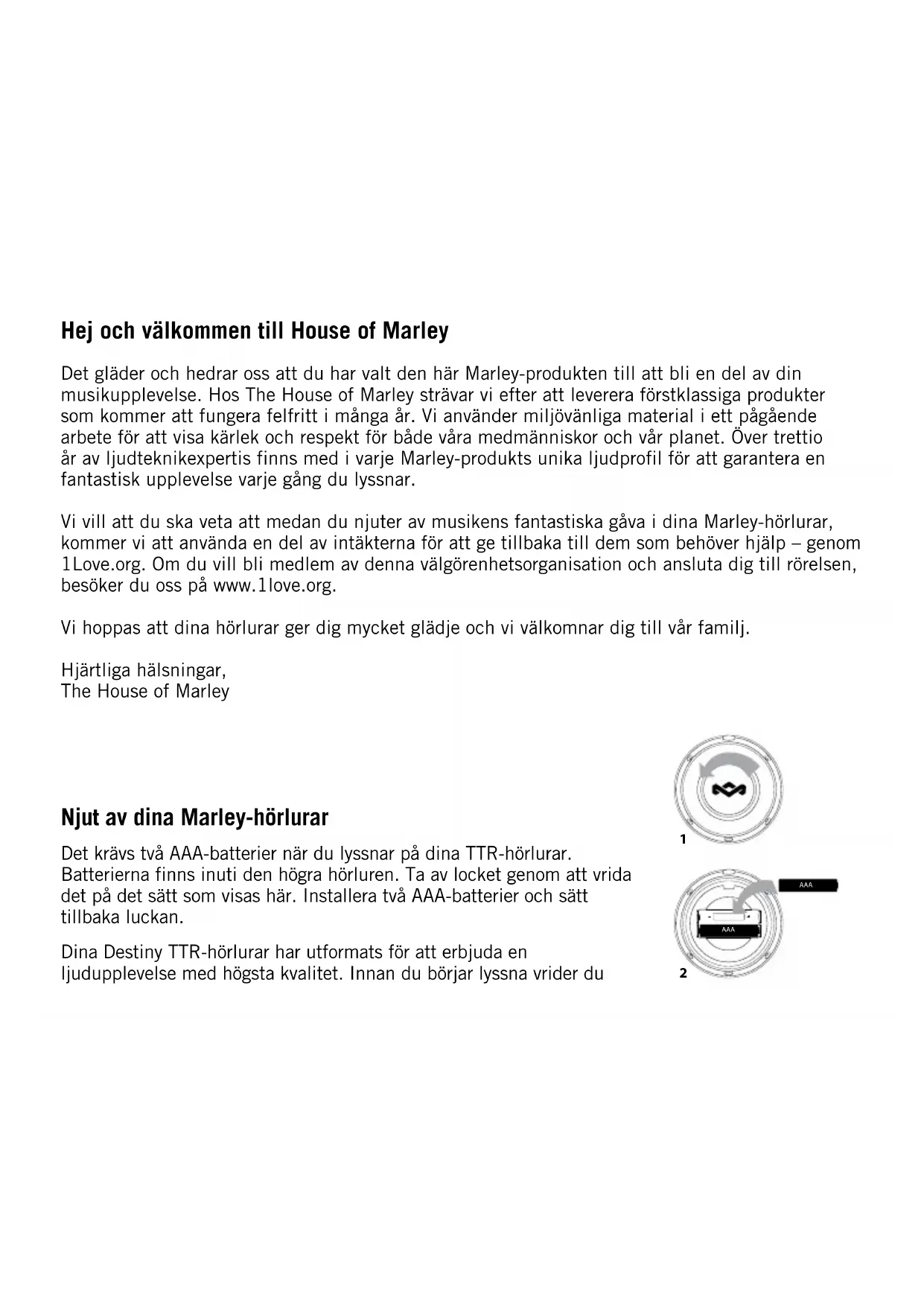 2hörlurarna till läget “On” genom att vrida på ratten på utsidan av den vänstra hörluren. Den lilla lampan tänds för att visa att hörlurarna är på och klara för att användas. Tekniken inuti dina TTR-hörlurar kommer aktivt att filtrera bort oönskat ljud utifrån samtidigt som den ger den detaljrikedom och kraft som din musik förtjänar. Dina Destiny Trenchtown Work-hörlurar levereras med två kablar. En kabel ska användas när du lyssnar på resande fot och när du använder hörlurarna tillsammans med en telefon för att ringa. Den andra kabeln är mycket längre och ska användas för stationärt lyssnande när du kan vara längre bort från ljudenheten. Varje kabel har en rak 3,5 mm-kontakt i den ände som ska anslutas till ingången på undersidan av den vänstra hörluren. Kompatibilitet för mikrofon och enknappskontroll Integrerad mikrofon möjliggör handsfree-samtal. Tryck på knappen för att svara i telefon. Tryck en gång till för att avsluta samtalet. Ansvarsfullt lyssnande Var noga med att sänka volymen på musikspelaren innan du börjar lyssna. Detta eliminerar risken för att skada din hörsel med en alltför hög ljudnivå. Använd aldrig hörlurar medan du använder maskiner, kör bil eller gör något annat där det är viktigt att höra yttre ljud. Om du någon gång upplever smärta eller obehag medan du lyssnar, eller efter att du har lyssnat, i hörlurarna kan det bero på att du lyssnar med en mycket hög ljudvolym som orsakar permanenta hörselskador. “O” Position “On” Position av påRiktlinjer från arbetsmiljöbyrån (Occupational Safety and Health Administration = OSHA) för tillåtna ljudnivåer och exponeringstider. Ljudtrycksnivå (Sound Pressure Level = SPL) Rekommenderad daglig exponeringstid 90dB 8 timmar 92dB 6 timmar 95dB 4 timmar 100dB 2 timmar 105dB 1 timme 110dB 30 minuter 115dB 15 minuter Högre än 115 dB undvik ljudtrycksnivåer som är 115 dB och högre Denna markering indikerar att denna produkt inte får avyttras med annat hushållsavfall inom EU. För att förhindra möjlig skada på miljö eller person från okontrollerat avfalls avyttrande, återvinn på ansvarsfullt vis för att främja det fortsatta återanvändandet av materialresurser. För att returnera din använda enhet, använd retur och insamlingssystemen eller kontakta återförsäljaren där produkten köptes. De kan se till att produkten återvinns på ett miljösäkert vis. WEEE-förklaringTvå års begränsad garanti House of Marley LLC garanterar att denna produkt är fri från material- och utförandefel under en två år lång period från och med inköpsdatum med undantag för vad som anges nedan. Produktgarantin från The House of Marley omfattar inte skador som orsakats av felaktig användning eller missbruk, olyckshändelser, fastsättning av otillåtna tillbehör, ändring av produkten eller vilken annat omständighet som helst som är utom The House of Marley:s kontroll. Denna garanti gäller endast om produkten har köpts och används i Storbritannien eller EU. En produkt som kräver modifiering eller anpassning för att kunna fungera i något annat land än det land för vilket den har konstruerats, tillverkats, godkänts eller tillåtits; eller reparation av produkter som skadats av dessa ändringar; täcks inte av denna garanti. The House of Marley LLC ansvarar inte för någon typ av indirekt skada, följdskada eller särskild skada. För att få garantiservice på din produkt ber vi dig kontakta återförsäljaren som produkten köptes av med ditt daterade inköpskvitto (som bevis på köpet). Vid mottagandet kommer återförsäljaren att reparera eller byta ut din produkt i förekommande fall. Om du inte kan ta dig till affären ska du kontakta The House of Marleys kundtjänst på tel. + 44 (0)203 441 1885 eller CS@thehouseofmarley.co.uk. The House of Marley PO Box 460, Tonbridge Kent TN9 9EW, UK Utförs det service på denna produkt av någon annan än The House of Marleys återförsäljare ogiltigförklaras garantin. Denna garanti påverkar inte dina lagstadgade rättigheter. Mer information om våra produkter hittar du på www.thehouseofmarley.com. Med ensamrätt.Γεια σας και καλωσορίσατε στη House of Marley Είναι χαρά και τιμή μας που επιλέξατε αυτό το προϊόν Marley για τη μουσική σας απόλαυση. Στη House of Marley προσπαθούμε να προσφέρουμε κορυφαία στην κατηγορία τους προϊόντα που θα προσφέρουν άψογη απόδοση για πολλά χρόνια, χρησιμοποιώντας παράλληλα φιλικά προς το περιβάλλον υλικά, σε μια διαρκή προσπάθεια έκφρασης αγάπης και σεβασμού προς τον άνθρωπο και τον πλανήτη. Η μοναδική ηχητική υπογραφή κάθε προϊόντος Marley ενσωματώνει περισσότερα από τριάντα χρόνια πείρας στη σχεδίαση συστημάτων ακρόασης, εξασφαλίζοντας μια εκπληκτική εμπειρία σε κάθε ακρόαση. Θέλουμε να γνωρίζετε ότι ενώ εσείς απολαμβάνετε το θαυμάσιο δώρο της μουσικής μέσω των ακουστικών Marley, εμείς διαθέτουμε ένα μέρος των εσόδων από την αγορά σας σε όσους έχουν ανάγκη, μέσω του οργανισμού 1Love.org. Για να γίνετε μέλος αυτού του φιλανθρωπικού οργανισμού και να συμμετάσχετε σε αυτή την κίνηση, επισκεφθείτε μας στη διεύθυνση www.1love.org. Ελπίζουμε ότι αυτά τα ακουστικά θα σας προσφέρουν