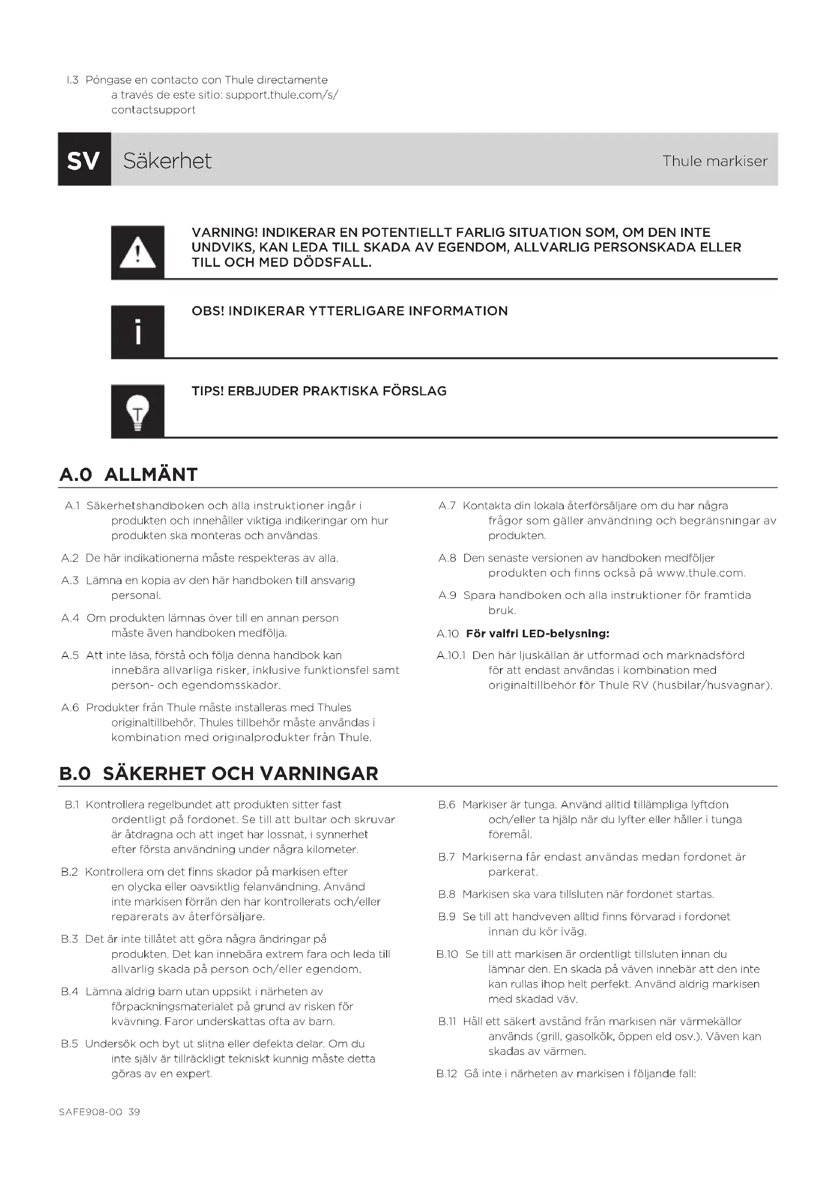A.1 Säkerhetshandboken och alla instruktioner ingår i produkten och innehåller viktiga indikeringar om hur produkten ska monteras och användas.A.2 De här indikationerna måste respekteras av alla.A.3 Lämna en kopia av den här handboken till ansvarig personal.A.4 Om produkten lämnas över till en annan person måste även handboken medfölja.A.5 Att inte läsa, förstå och följa denna handbok kan innebära allvarliga risker, inklusive funktionsfel samt person- och egendomsskador.A.6 Produkter från Thule måste installeras med Thules originaltillbehör. Thules tillbehör måste användas i kombination med originalprodukter från Thule.A.7 Kontakta din lokala återförsäljare om du har några frågor som gäller användning och begränsningar av produkten.A.8 Den senaste versionen av handboken medföljer produkten och finns också på www.thule.com.A.9 Spara handboken och alla instruktioner för framtida bruk.A.10 För valfri LED-belysning:A.10.1 Den här ljuskällan är utformad och marknadsförd för att endast användas i kombination med originaltillbehör för Thule RV (husbilar/husvagnar).