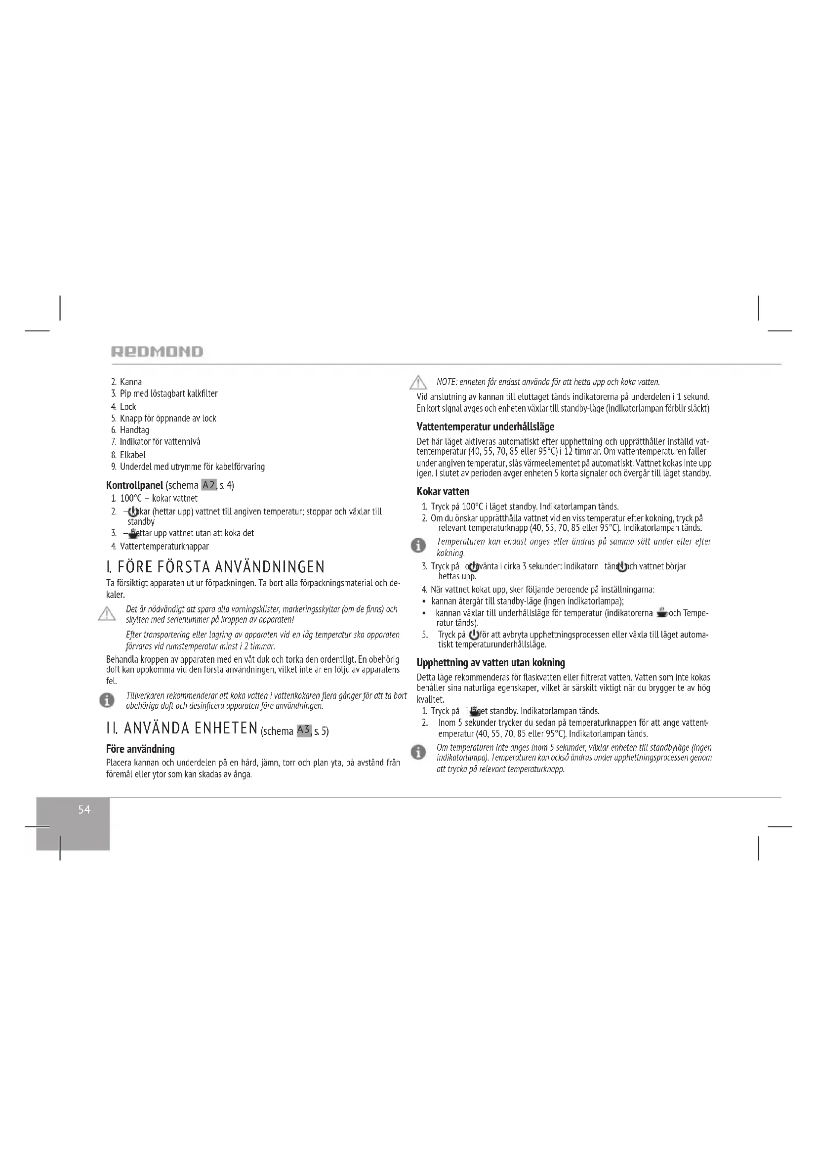 , s. 5) Före användning Placera kannan och underdelen på en hård, jämn, torr och plan yta, på avstånd från föremål eller ytor som kan skadas av ånga. NOTE: enheten får endast använda för att hetta upp och koka vatten. Vid anslutning av kannan till eluttaget tänds indikatorerna på underdelen i 1 sekund. En kort signal avges och enheten växlar till standby-läge (indikatorlampan förblir släckt) Vattentemperatur underhållsläge Det här läget aktiveras automatiskt efter upphettning och upprätthåller inställd vat- tentemperatur (40, 55, 70, 85 eller 95°С) i 12 timmar. Om vattentemperaturen faller under angiven temperatur, slås värmeelementet på automatiskt. Vattnet kokas inte upp igen. I slutet av perioden avger enheten 5 korta signaler och övergår till läget standby. Kokar vatten