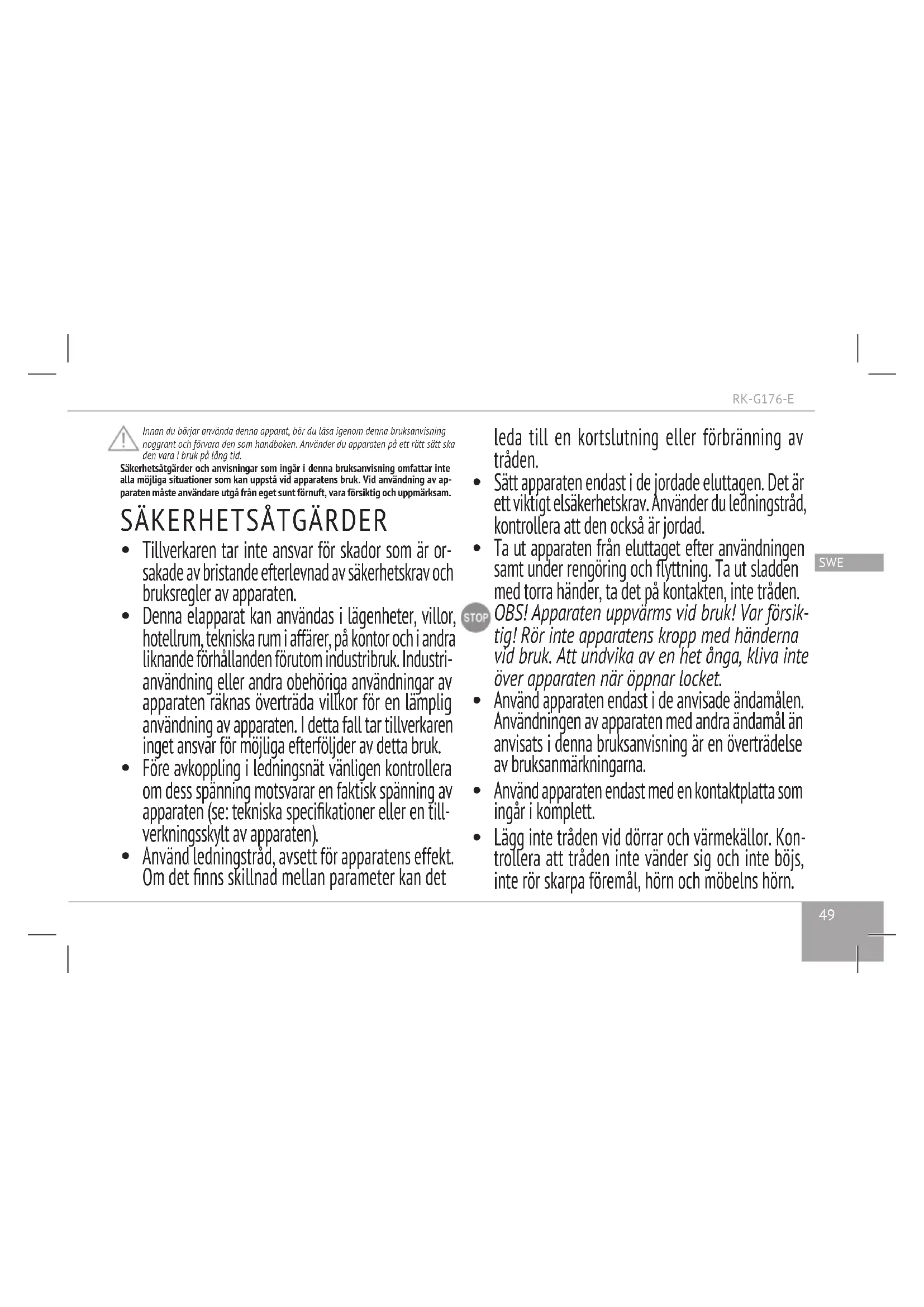 En fristående reparation av apparaten och byte idess konstruktion är förbjudna. Alla servicearbeten ska genomföras i en auktoriserad service center. Oprofes- sionellt genomförda arbetet kan följa till brytande av apparaten, skadegörande och åverkan av tillhörigheten. OBS! Det är förbjudet att bruka apparaten vid vilka fel som helst.RK-G176-E