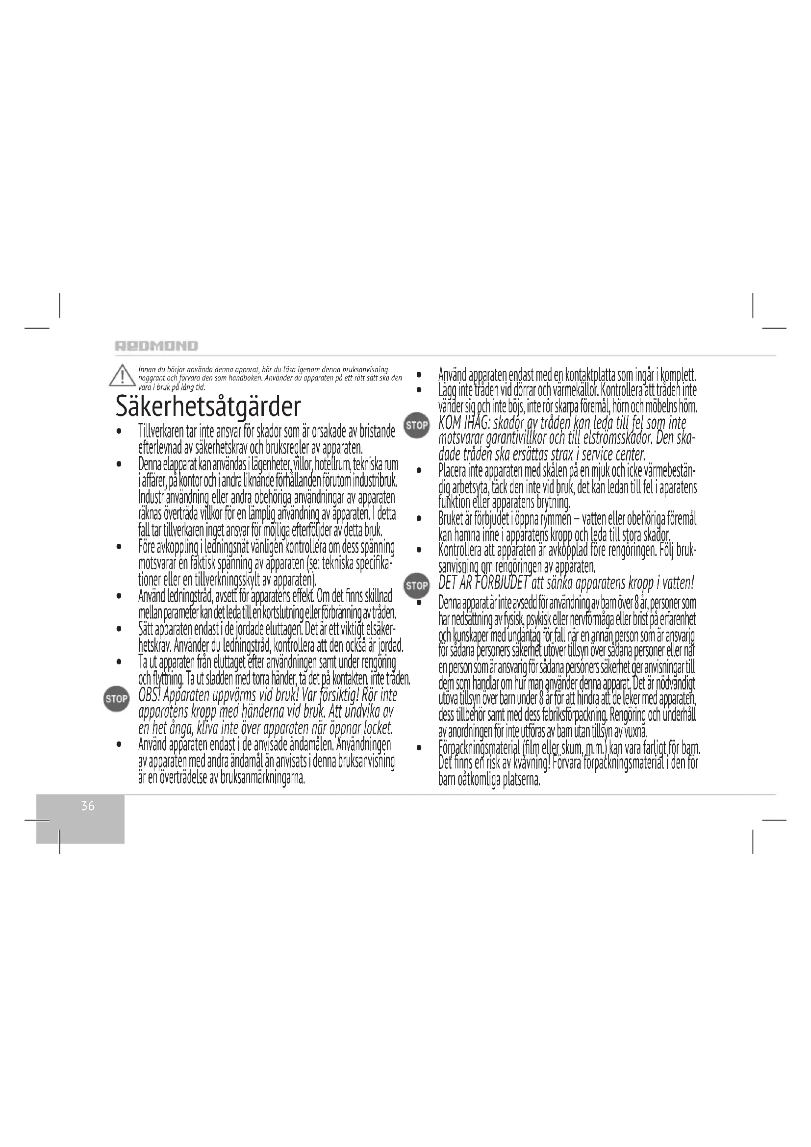 Ta ut apparaten från eluttaget efter användningen samt under rengöring och yttning. Ta ut sladden med torra händer, ta det på kontakten, inte tråden. OBS! Apparaten uppvärms vid bruk! Var försiktig! Rör inte apparatens kropp med händerna vid bruk. Att undvika av en het ånga, kliva inte över apparaten när öppnar locket.