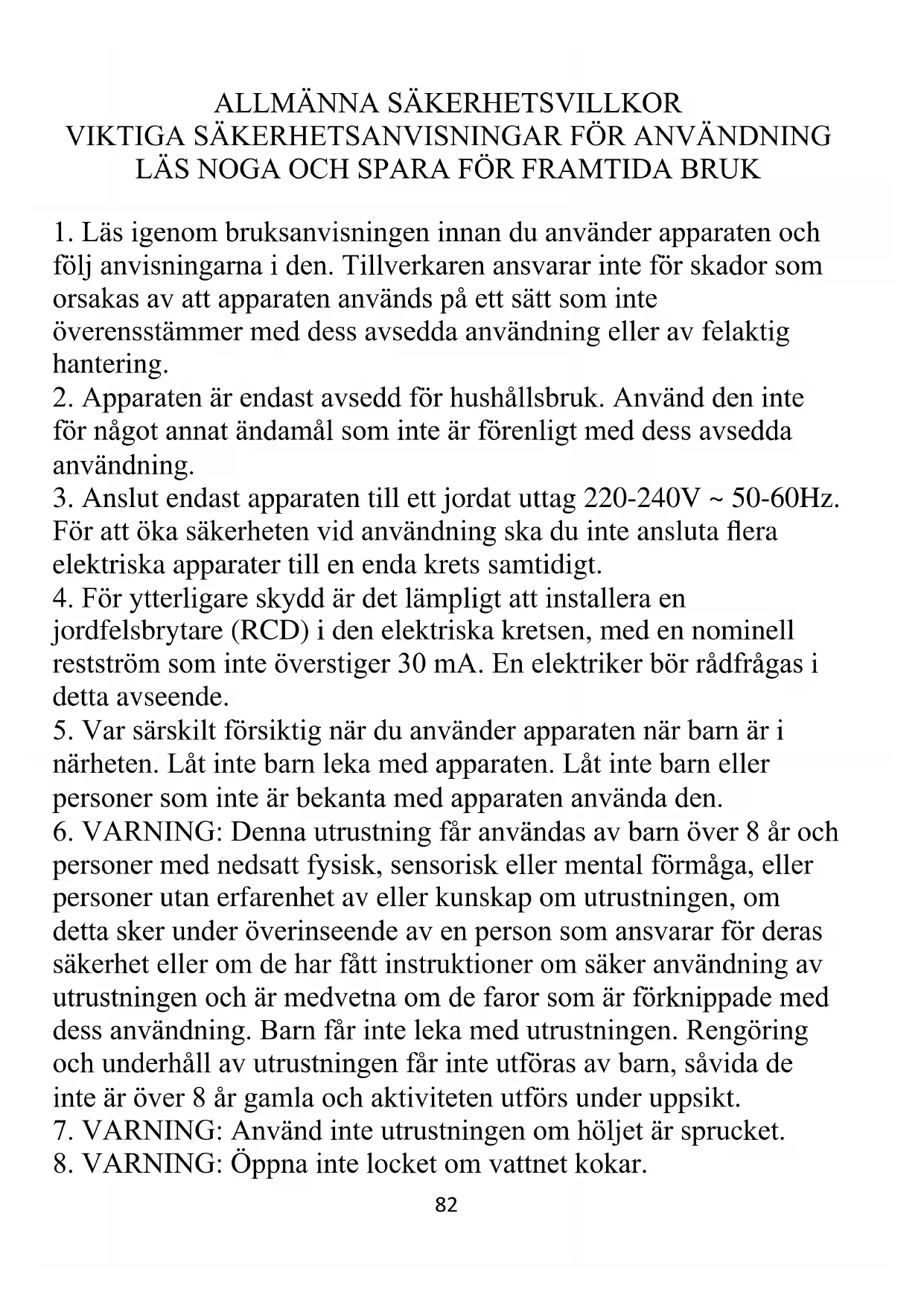 personer med nedsatt fysisk, sensorisk eller mental förmåga, eller personer utan erfarenhet av eller kunskap om utrustningen, om detta sker under överinseende av en person som ansvarar för deras säkerhet eller om de har fått instruktioner om säker användning av utrustningen och är medvetna om de faror som är förknippade med dess användning. Barn får inte leka med utrustningen. Rengöring och underhåll av utrustningen får inte utföras av barn, såvida de inte är över 8 år gamla och aktiviteten utförs under uppsikt.