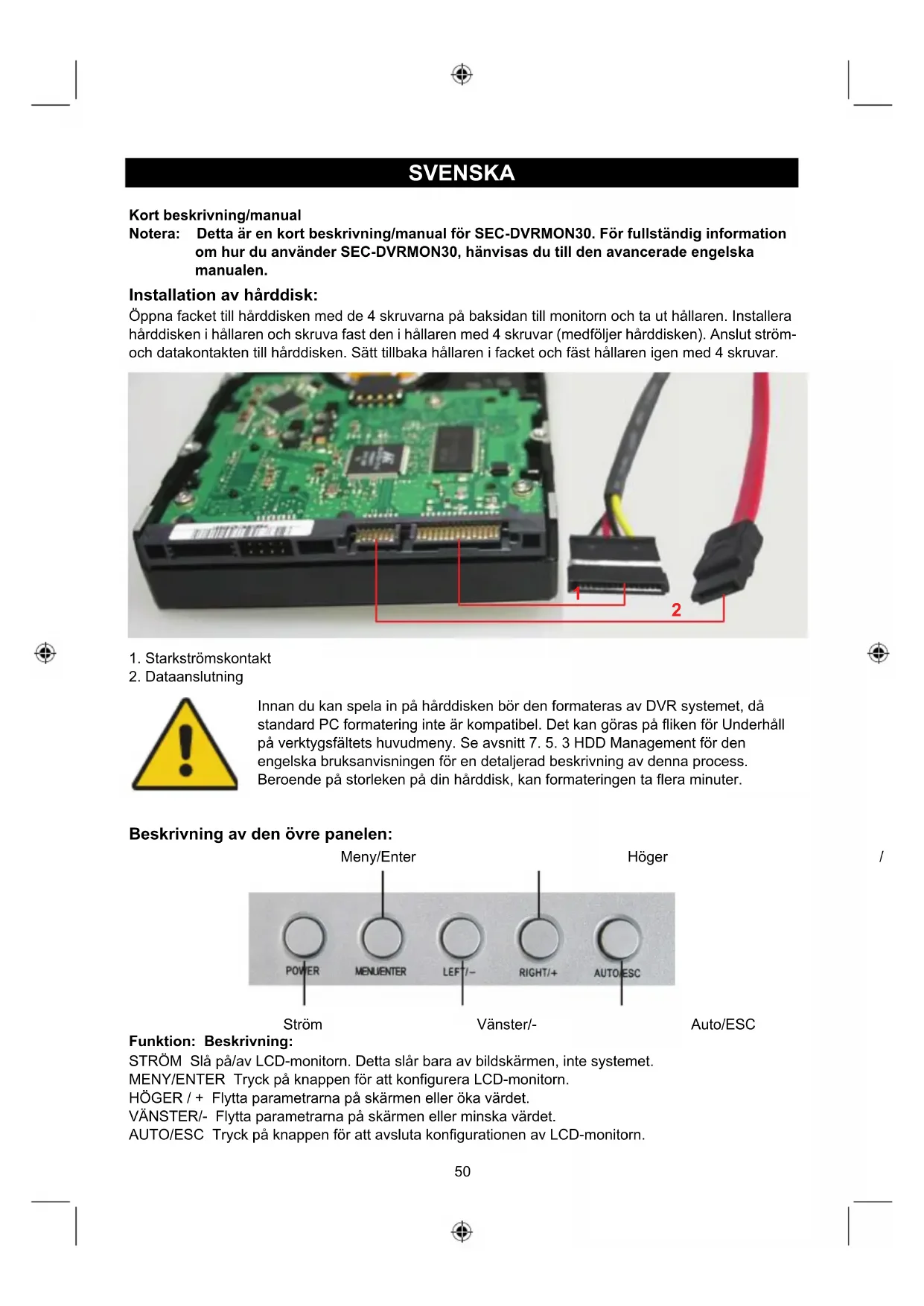 Innan du kan spela in på hårddisken bör den formateras av DVR systemet, då standard PC formatering inte är kompatibel. Det kan göras på fliken för Underhåll på verktygsfältets huvudmeny. Se avsnitt 7. 5. 3 HDD Management för den engelska bruksanvisningen för en detaljerad beskrivning av denna process. Beroende på storleken på din hårddisk, kan formateringen ta flera minuter. Beskrivning av den övre panelen: Meny/Enter Höger / + Ström Vänster/- Auto/ESC Funktion: Beskrivning: STRÖM Slå på/av LCD-monitorn. Detta slår bara av bildskärmen, inte systemet. MENY/ENTER Tryck på knappen för att konfigurera LCD-monitorn. HÖGER / + Flytta parametrarna på skärmen eller öka värdet. VÄNSTER/- Flytta parametrarna på skärmen eller minska värdet. AUTO/ESC Tryck på knappen för att avsluta konfigurationen av LCD-monitorn.