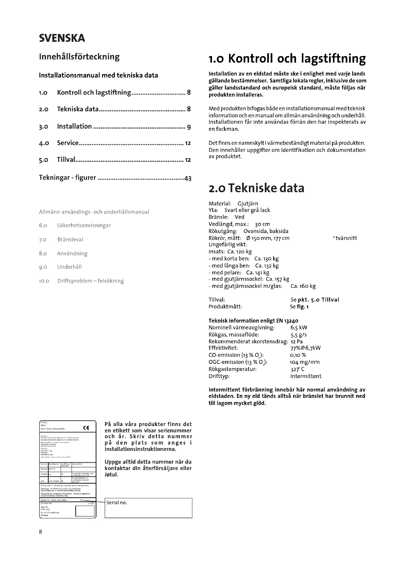 Pa alla vara Produkter finns det en etikett som visar serienummer och ar. Skriv detta nummer pa den plats som anges i installationsinstruktionerna.