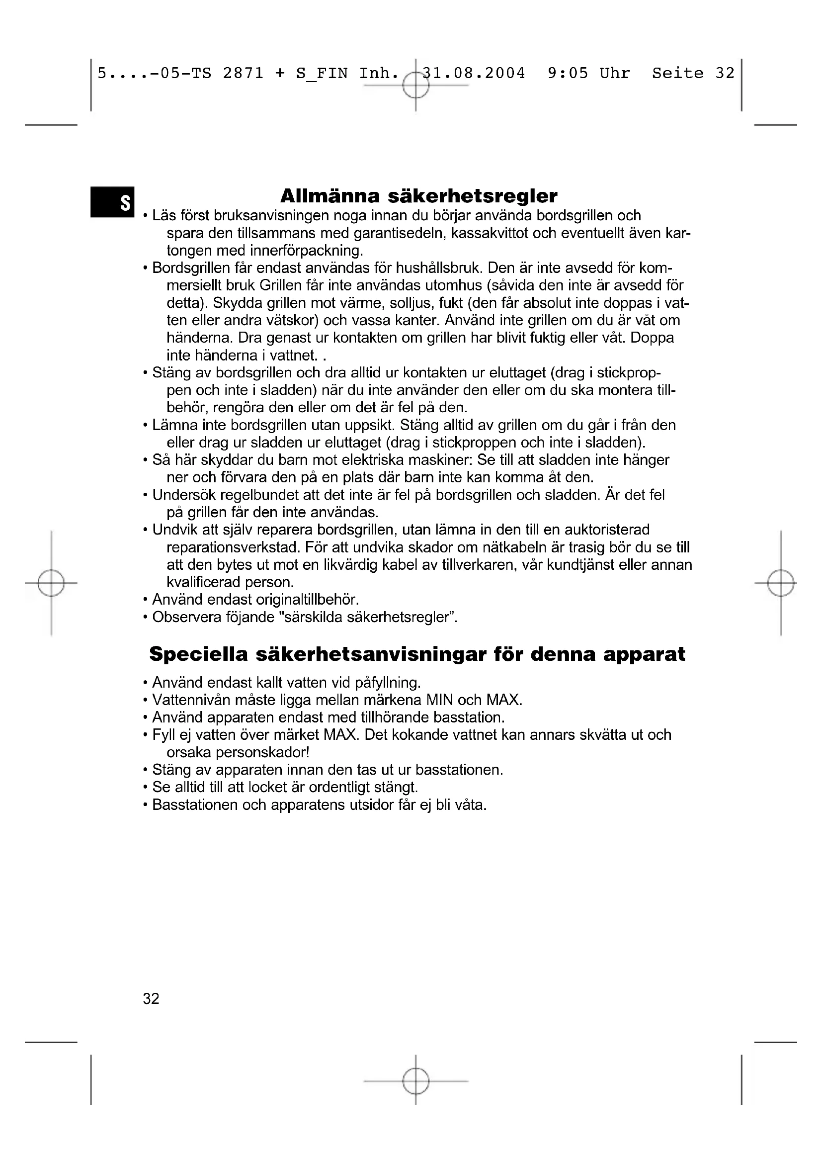 5....-05-TS 2871 + S_FIN Inh. 31.08.2004 9:05 Uhr Seite 32Apparatens beståndsdelar Basstation 1 Strömbrytare för värmeelement 2 Värmeelement 3 Signallampa för värmeelement 4 Anslutning för vattenkokaren 5 Nätkabel Tekanna 6 Lock 7 Handtag 8 Tefilter Vattenkokare 9 Lock 10 Strömbrytare 11 Nivåindikator för vattenmängd 12 Snipe med kalkfilter 13 Elektrisk anslutning till basen Idrifttagande av apparaten Läs igenom denna bruksanvisning noggrannt och förvara den vid en säker ort. Spola tekannan och koka ur vattenkokaren två gånger med färskt vatten före första användningen. Använd endast färskt vatten utan tillsatser. Elektrisk anslutning