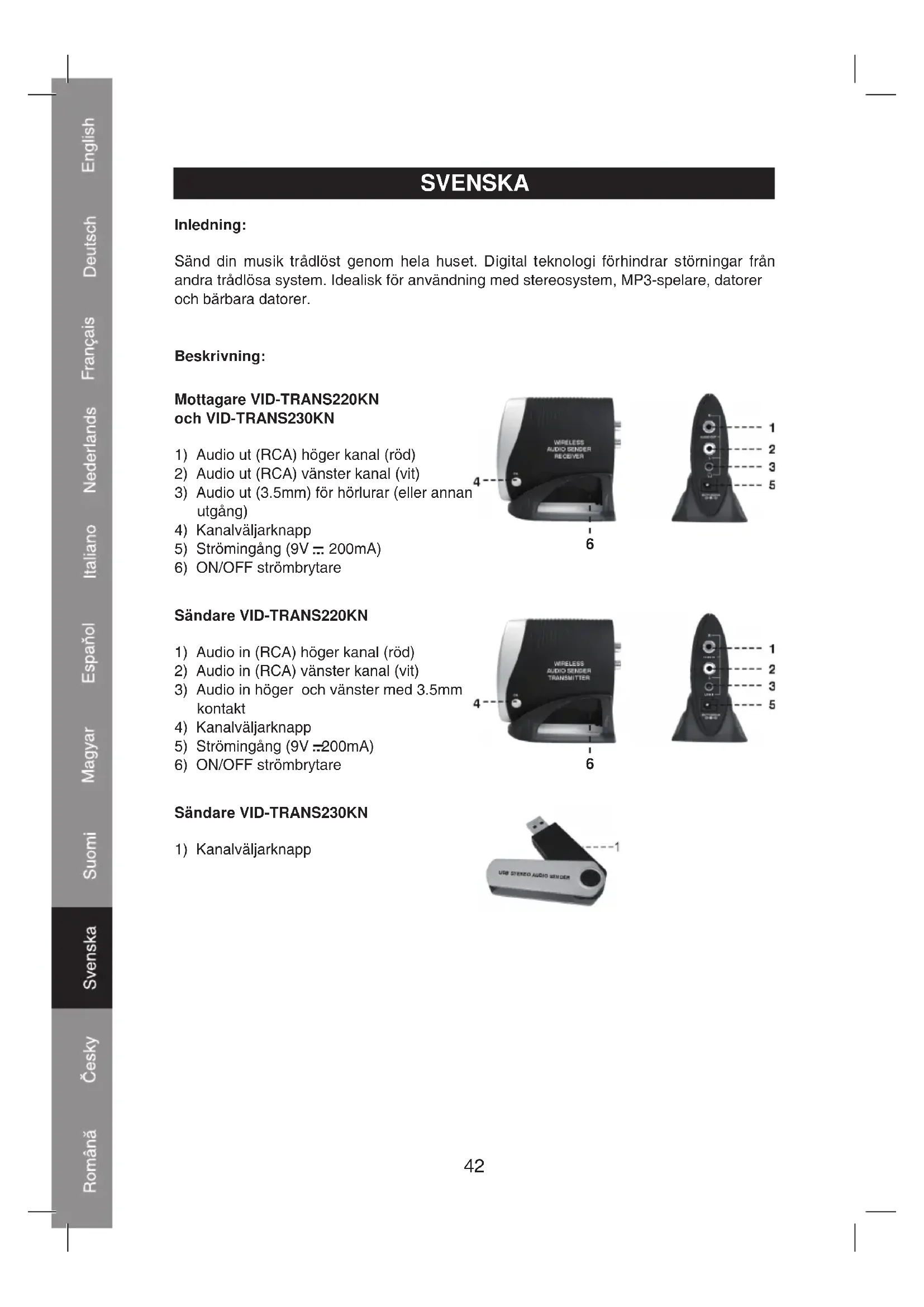 kanalväljareknappen på mottagaren. Den stäms sedan automatiskt av på kanalen som används. Specifikationer: Sändare VID-TRANS220KN Frekvensområde: 2.400~2.483Ghz Kanaler: 8 Modulation: FSK (frekvensskiftmodulering) Ljudingångar: 2x RCA (R/L), 3.5mm Strömingång: 9V/200mA Sändare VID-TRANS230KN Frekvensområde: 2.400~2.483 Ghz Kanaler: 8 Modulation: FSK (frekvensskiftmodulering) Ljudingångar: via USB Strömingång: via USB Mottagare VID-TRANS220KN och VID-TRANS230KN Frekvensområde: 2.400~2.483 Ghz Kanaler: 8 Modulation: FSK (frekvensskiftmodulering) Audio-utgång: 2x RCA, 3.5mm Signalbrusförhållande: 87dB Strömingång: 9V/200mA45