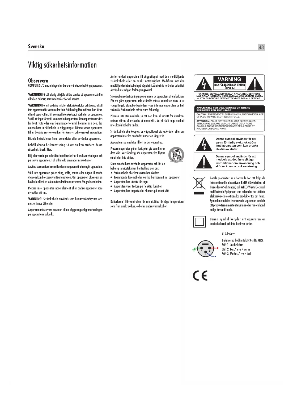 Ingresso PC-USB Formato Note Formato determinato dal software Media Player / Server utilizzato. Qualsiasi formato supportato dal software del PC: 44.1K, 48k, 88.2K, 96K, 176.4K, 16 bit, 24 bit Ingresso Elettrico coassiale/Ottico Formato Note SPDIF LPCM 44.1K, 48k, 88.2K, 96K, 176.4K, 192K 16 bit, 24 bit Caratteristiche tecniche RDD-1580 Distorsione armonica totale < 0,004% Distorsione d’intermodulazione (60 Hz : 7 kHz) < 0,004% Risposta in frequenza 10 Hz – 95 kHz ±3 dB max Rapporto S/R (pesato “A” IHF) 128 dB Sensibilità ingresso / Impedenza 0 dBfs / 75 ohm Livello d’uscita / Impedenza (RCA) 2 V / 100 ohm Livello d’uscita / Impedenza (XLR) 4 V / 200 ohm Segnali digitali decodificabili – WAV, MP3, WMA ingresso USB frontale (fino a 16 bit/48 kHz) Segnali digitali decodificabili – SPDIF LPCM ingressi elettrico/ottico (fino a 24 bit/192 kHz) Segnali digitali decodificabili – ingresso PC‑USB WAV/PCM in funzione del sw Media Player in uso sul PC (fino a 24 bit/192 kHz) Alimentazione AC 120 V, 60 Hz (USA) AC 230 V, 50 Hz (Europa) Assorbimento 25 watt Assorbimento in standby (modalità normale) 0,5 watt Dimensioni Larghezza x Altezza x Profondità 431 x 55 x 316 mm Altezza panello frontale 43,7 mm, 1U rack Peso (netto) 5,1 kg Tutte le caratteristiche dichiarate sono esatte al momento della stampa. Rotel si riserva il diritto di apportare miglioramenti senza alcun preavviso. Rotel e il logo Rotel HiFi sono marchi registrati della The Rotel Co. Ltd. Tokyo Japan. “Made for iPod” e “Made for iPhone” significano che un dispositivo elettronico accessorio è stato progettato specificamente per essere utilizzato con un iPod o iPhone ed è certificato dai suoi sviluppatori conforme agli standard Apple. Apple non è responsabile del funzionamento di questo accessorio, né della sua conformità alle regolamentazioni di sicurezza. Si consideri che l’utilizzo di tali accessori con l’iPod o l’iPhone può interferire con il corretto funzionamento dei sistemi di trasmissione senza fili. iPhone, iPod, iPod classic, iPod nano ed iPod touch sono marchi di fabbrica di Apple Inc. registrati in USA ed altri Paesi.43 Svenska Observera COMPUTER I/O-anslutningen får bara användas av behöriga personer. VARNING! Försök aldrig att själv utföra service på apparaten. Anlita alltid en behörig servicetekniker för all service. VARNING! För att undvika risk för elektriska stötar och brand, utsätt inte apparaten för vatten eller fukt. Ställ aldrig föremål som kan läcka eller droppa vatten, till exempel blomkrukor, i närheten av apparaten. Se till att inga föremål kommer in i apparaten. Om apparaten utsätts för fukt, väta eller om främmande föremål kommer in i den, dra omedelbart ut nätkabeln ur vägguttaget. Lämna sedan apparaten till en behörig servicetekniker för översyn och eventuell reparation. Läs alla instruktioner innan du ansluter eller använder apparaten. Behåll denna bruksanvisning så att du kan studera dessa säkerhetsföreskrifter. Följ alla varningar och säkerhetsföreskrifter i bruksanvisningen och på själva apparaten. Följ alltid alla användarinstruktioner. Använd bara en torr trasa eller dammsugaren när du rengör apparaten. Ställ inte apparaten på en säng, soffa, matta eller någon liknande yta som kan blockera ventilationshålen. Om apparaten placeras i en bokhylla eller i ett skåp måste det finnas utrymme för god ventilation. Placera inte apparaten nära element eller andra apparater som utvecklar värme. VARNING! Strömkabeln används som huvudströmbrytare och måste finnas åtkomlig. Apparaten måste vara ansluten till ett vägguttag enligt markeringen på apparatens baksida. Rotels produkter är utformade för att följa de internationella direktiven RoHS (Restriction of Hazardeous Substances) och WEEE (Waste Electrical and Electronic Equipment) som behandlar hur uttjänta elektriska och elektroniska produkter tas om hand. Symbolen med den överkorsade soptunnan innebär att produkterna måste återvinnas eller tas om hand enligt dessa direktiv. Viktig säkerhetsinformation Anslut endast apparaten till vägguttaget med den medföljande strömkabeln eller en exakt motsvarighet. Modifiera inte den medföljande strömkabeln på något sätt. Ändra inte jord eller polaritet. Använd inte någon förlängningskabel. Strömkabeln och strömingången är en del av apparatens strömfunktion. För att göra apparaten helt strömlös måste kontakten dras ut ur vägguttaget. Standby-lysdioden lyser inte när apparaten är helt strömlös. Strömkabeln måste vara åtkomlig. Placera inte strömkabeln så att den kan bli utsatt för åverkan, extrem värme eller skadas på annat sätt. Var särskilt noga med att inte skada kabelns ändar. Strömkabeln ska kopplas ur vägguttaget vid åskväder eller om apparaten inte ska användas under en längre tid. Apparaten ska anslutas till ett jordat vägguttag. Placera apparaten på en fast, plan yta som klarar dess vikt. Var försiktig när apparaten ska flyttas så att den inte välter. Sluta omedelbart använda apparaten och låt en behörig servicetekniker kontrollera den om: