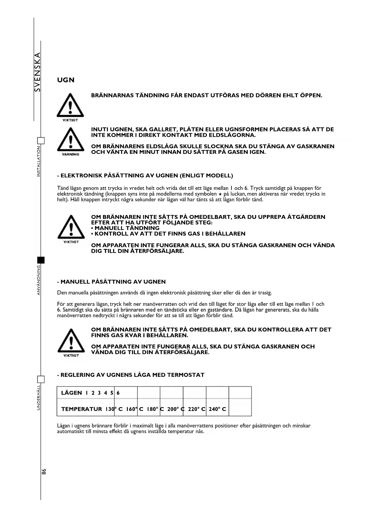 - Kontroll aV att det Finns gas i behÅllaren OM APPARATEN INTE FUNGERAR ALLS, SKA DU STÄNGA GASKRANEN OCH VÄNDA DIG TILL DIN ÅTERFÖRSÄLJARE. Den manuella påsättningen används då ingen elektronisk påsättning sker eller då den är trasig. - REGLERING AV UGNENS LÅGA MED TERMOSTAT Lågan i ugnens brännare förblir i maximalt läge i alla manöverrattens positioner efter påsättningen och minskar automatiskt till minsta effekt då ugnens inställda temperatur nås. LÄGEN 1 2 3 4 5 6 TEMPERATUR 130° C 160° C 180° C 200° C 220° C 240° CINSTALLATIONANVÄNDNING UNDERHÅLL