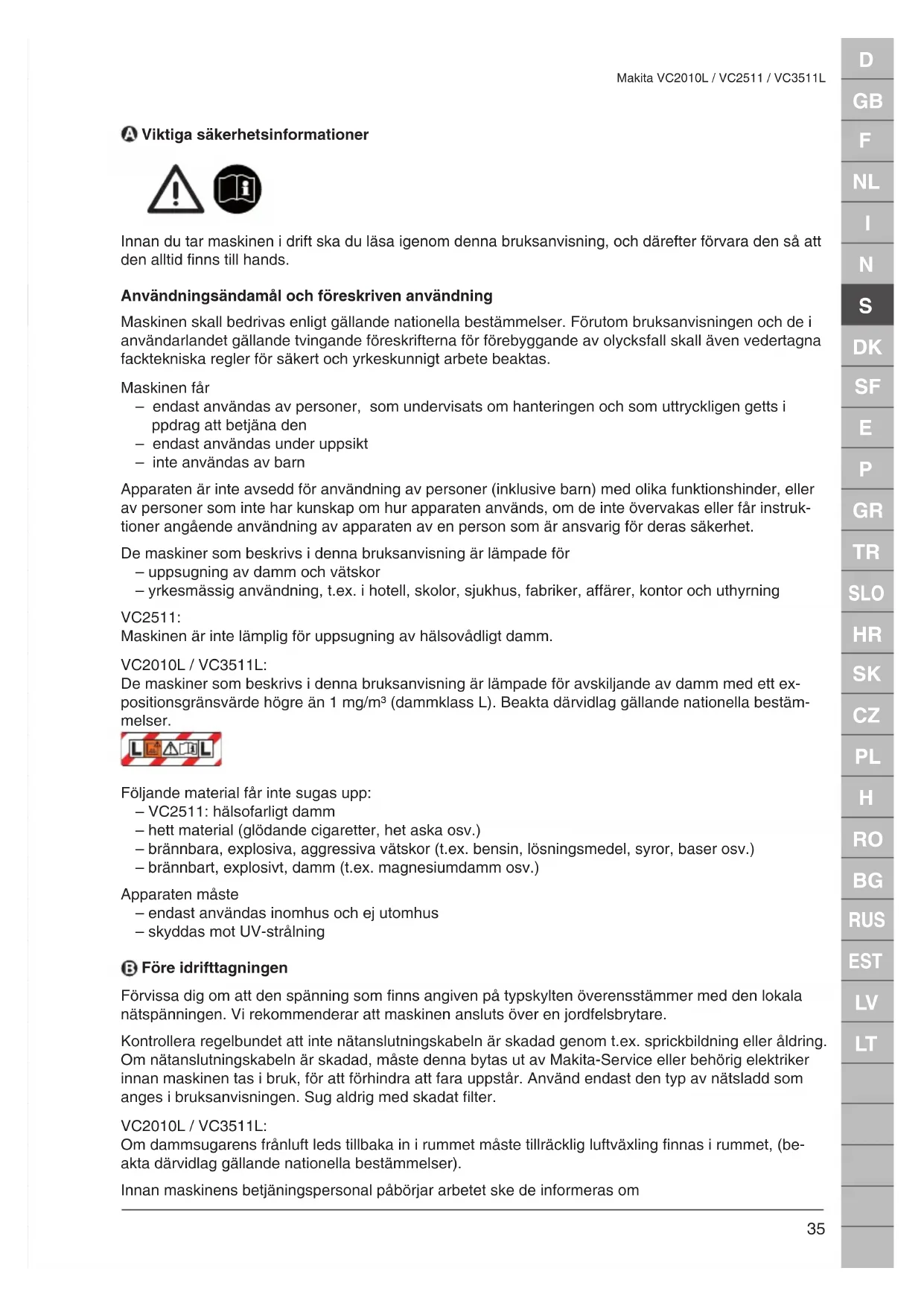 Makita VC2010L / VC2511 / VC3511L Viktiga säkerhetsinformationer Innan du tar maskinen i drift ska du läsa igenom denna bruksanvisning, och därefter förvara den så att den alltid finns till hands. Användningsändamål och föreskriven användning Maskinen skall bedrivas enligt gällande nationella bestämmelser. Förutom bruksanvisningen och de i användarlandet gällande tvingande föreskrifterna för förebyggande av olycksfall skall även vedertagna facktekniska regler för säkert och yrkeskunnigt arbete beaktas. Maskinen får – endast användas av personer, som undervisats om hanteringen och som uttryckligen getts i ppdrag att betjäna den – endast användas under uppsikt – inte användas av barn Apparaten är inte avsedd för användning av personer (inklusive barn) med olika funktionshinder, eller av personer som inte har kunskap om hur apparaten används, om de inte övervakas eller får instruk- tioner angående användning av apparaten av en person som är ansvarig för deras säkerhet. De maskiner som beskrivs i denna bruksanvisning är lämpade för – uppsugning av damm och vätskor – yrkesmässig användning, t.ex. i hotell, skolor, sjukhus, fabriker, affärer, kontor och uthyrning VC2511: Maskinen är inte lämplig för uppsugning av hälsovådligt damm. VC2010L / VC3511L: De maskiner som beskrivs i denna bruksanvisning är lämpade för avskiljande av damm med ett ex- positionsgränsvärde högre än 1 mg/m³ (dammklass L). Beakta därvidlag gällande nationella bestäm- melser. Följande material får inte sugas upp: – VC2511: hälsofarligt damm – hett material (glödande cigaretter, het aska osv.) – brännbara, explosiva, aggressiva vätskor (t.ex. bensin, lösningsmedel, syror, baser osv.) – brännbart, explosivt, damm (t.ex. magnesiumdamm osv.) Apparaten måste – endast användas inomhus och ej utomhus – skyddas mot UV-strålning Före idrifttagningen Förvissa dig om att den spänning som finns angiven på typskylten överensstämmer med den lokala nätspänningen. Vi rekommenderar att maskinen ansluts över en jordfelsbrytare. Kontrollera regelbundet att inte nätanslutningskabeln är skadad genom t.ex. sprickbildning eller åldring. Om nätanslutningskabeln är skadad, måste denna bytas ut av Makita-Service eller behörig elektriker innan maskinen tas i bruk, för att förhindra att fara uppstår. Använd endast den typ av nätsladd som anges i bruksanvisningen. Sug aldrig med skadat filter. VC2010L / VC3511L: Om dammsugarens frånluft leds tillbaka in i rummet måste tillräcklig luftväxling finnas i rummet, (be- akta därvidlag gällande nationella bestämmelser). Innan maskinens betjäningspersonal påbörjar arbetet ske de informeras omD