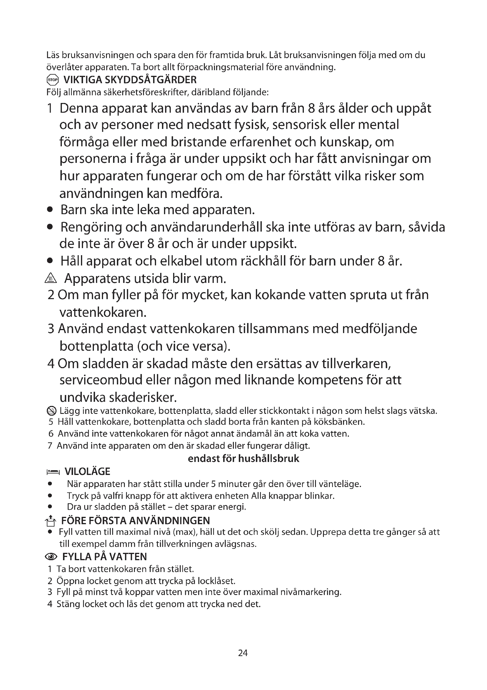 - Håll apparat och elkabel utom räckhåll för barn under 8 år. ¬ Apparatens utsida blir varm. 2 Om man fyller på för mycket, kan kokande vatten spruta ut från vattenkokaren. 3 Använd endast vattenkokaren tillsammans med medföljande bottenplatta (och vice versa). 4 Om sladden är skadad måste den ersättas av tillverkaren, serviceombud eller någon med liknande kompetens för att undvika skaderisker. H Lägg inte vattenkokare, bottenplatta, sladd eller stickkontakt i någon som helst slags vätska. 5 Håll vattenkokare, bottenplatta och sladd borta från kanten på köksbänken. 6 Använd inte vattenkokaren för något annat ändamål än att koka vatten. 7 Använd inte apparaten om den är skadad eller fungerar dåligt. endast för hushållsbruk